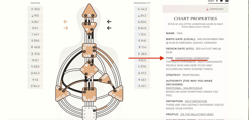 Hinter dem Wort Typ im Chart könntest du Generator, Manifestierender Generator, Manifestor, Projektor oder Reflektor lesen. Das sind die 5 Typen im Human Design. Zu ihnen gehören die jeweiligen Autoritäten. Ich hatte in diesem Post über die Autorität berichtet, werde aber noch einen eigenen Post dazu kreieren.