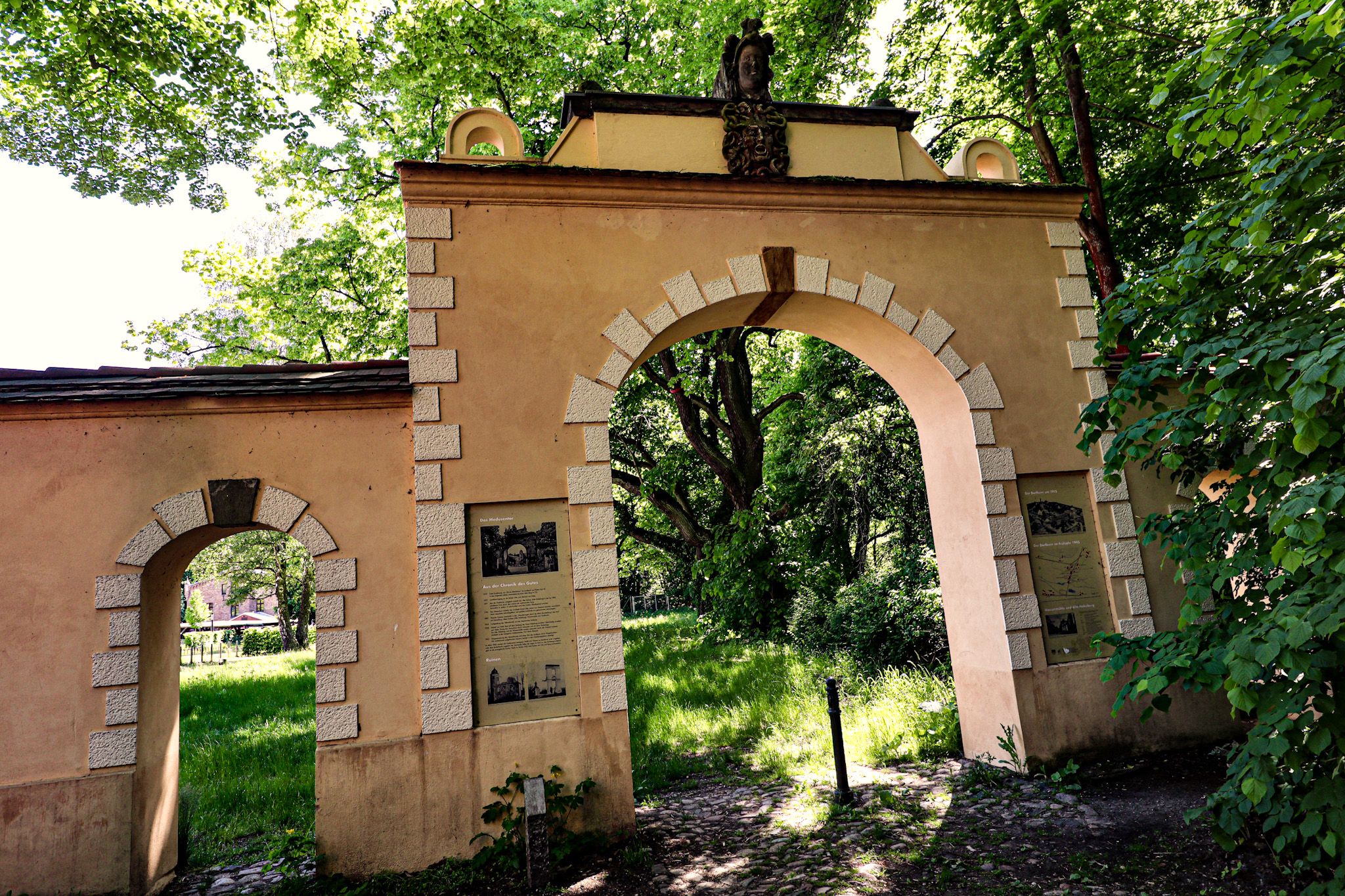 Das Tor steht an der Zufahrt zum Gutshof und trägt einen Medusenkopf und eine Minerva als Schmuck. Ich finde es sieht hübsch aus und eignet sich als Fotospot super. Schön, dass es wieder hergerichtet wurde. An beiden Seiten befinden sich Tafeln zur Geschichte des Gutes, mit Text und Bildern.