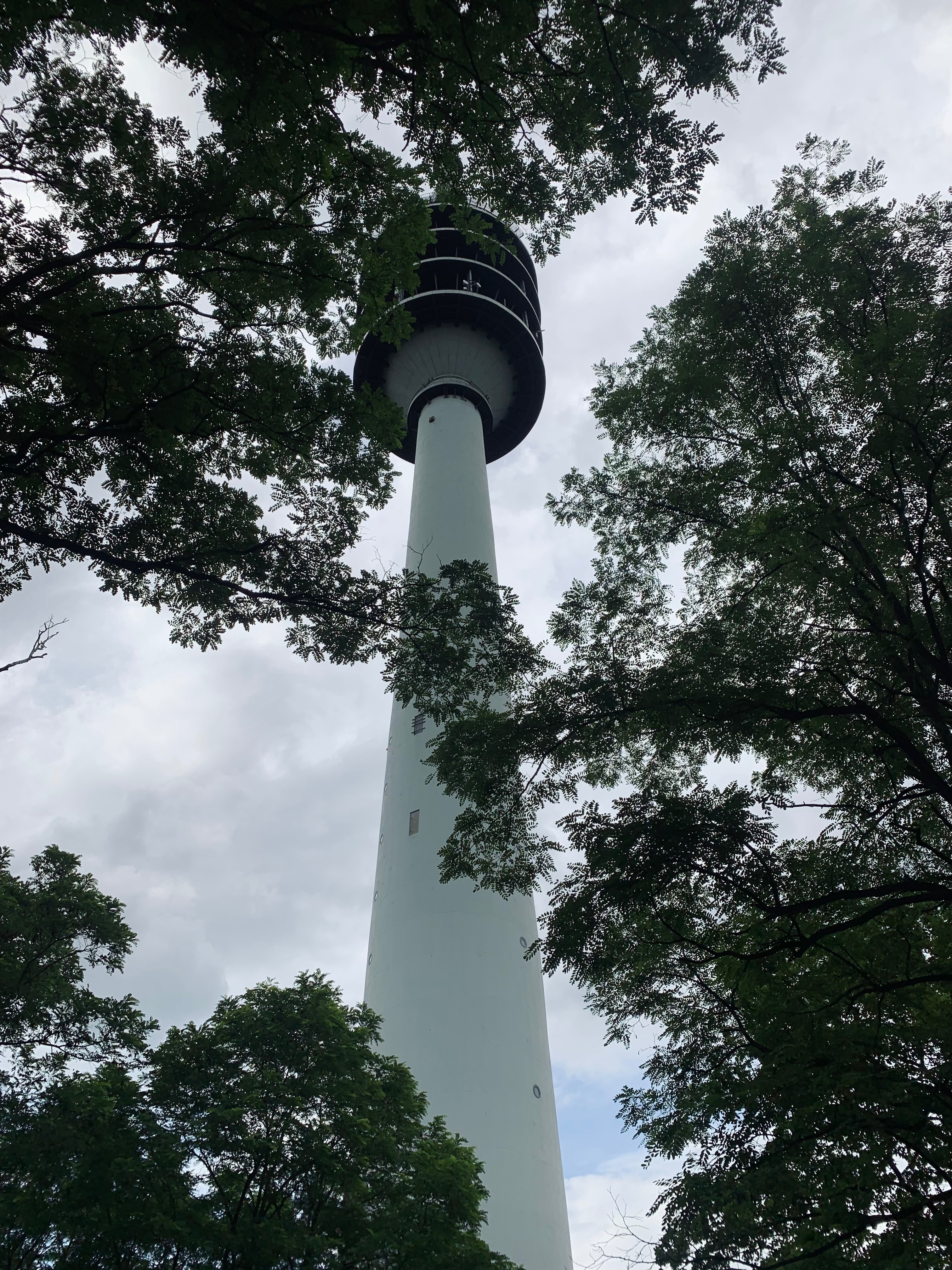 Oben erwartet mich ein Wanderweg, dem ich nach rechts, in Richtung Turm folge. Durch den Wald geht es immer weiter an der Königsstraße entlang. Der Straßenlärm ist hier nicht ganz verschwunden, dennoch, ein lohnenswerter Weg. Auf Höhe des Turmes geht ein Pfad durch den Wald nach oben, den wähle ich und komme kurz vor dem Turm heraus. Sogleich wird mir bewusst, warum man ihn auf der anderen Seite so deutlich sehen kann. Das Ding ist riesig.