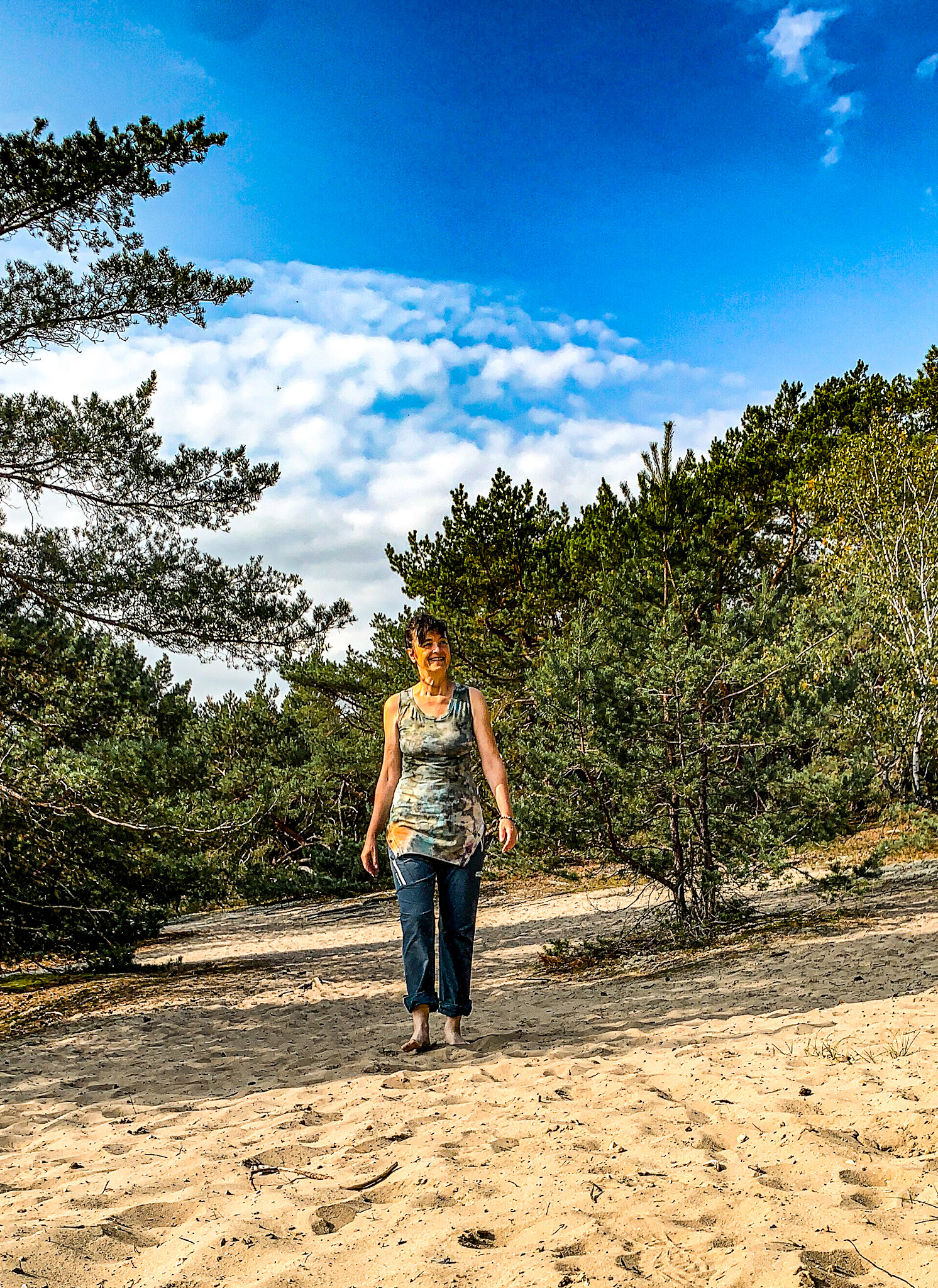 Schließlich fällt der Weg in eine der Senken ab, um auf der anderen Seite gleich wieder anzusteigen, diesmal auf den 90m hohen Kesselberg. Es geht in einem, für die Gegend typischen Sandfeld bergan. Ostseesand, den die letzte Eiszeit praktischerweise hier anlieferte.