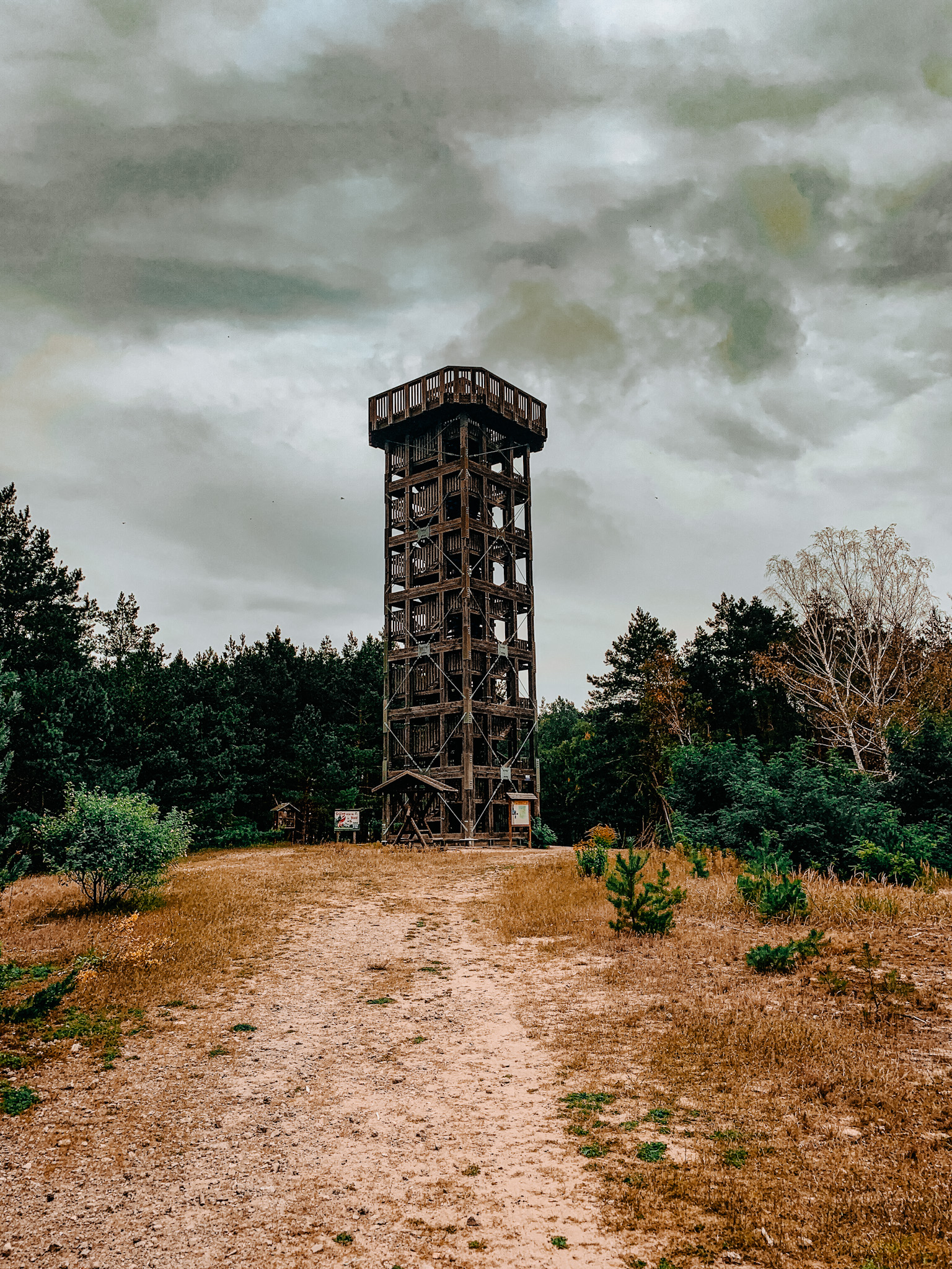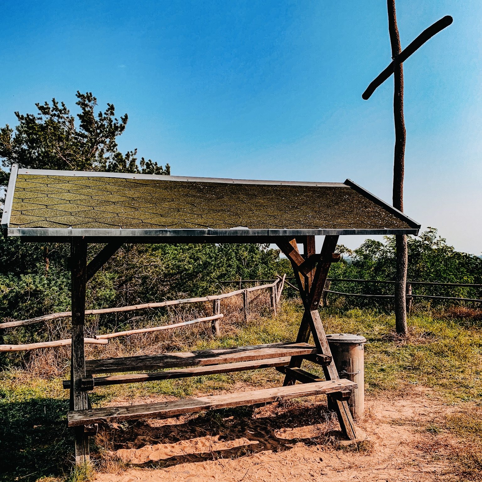 Auf dem Plateau erwartet dich wieder loser Sand, der dich, vorbei am ehemaligen UKW Richtstrahl Drehfunkfeuer über eine mit Gras bewachsene Dünenlandschaft, eingerahmt von den typischen Krüppelkiefern der Region bis zum Gipfelkreuz führt. Ein Picknickplatz lädt zu verweilen ein und an schönen Tagen kannst du hier den Ausblick über die Niederungen des Glauer Tals mit ihren Flachseen genießen.