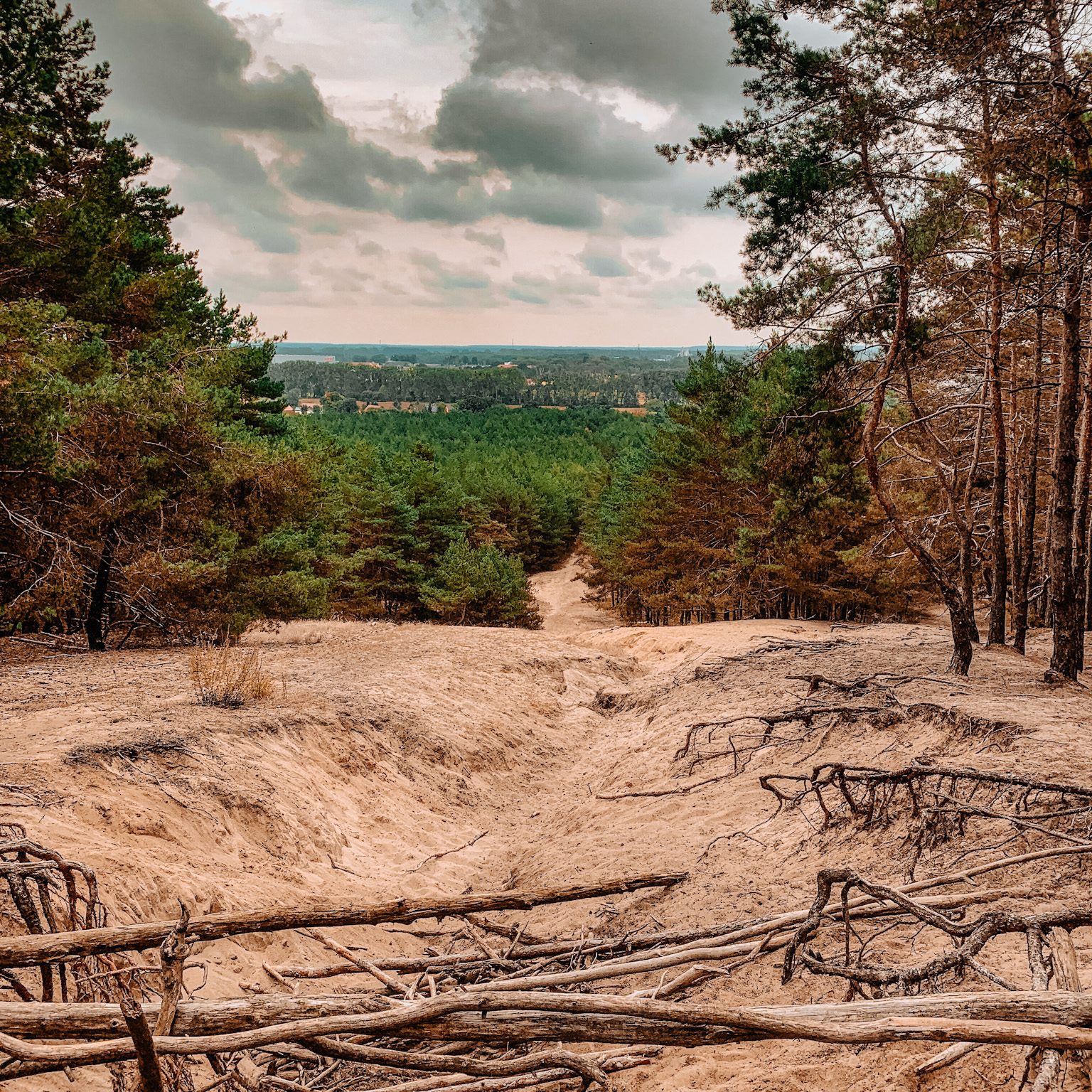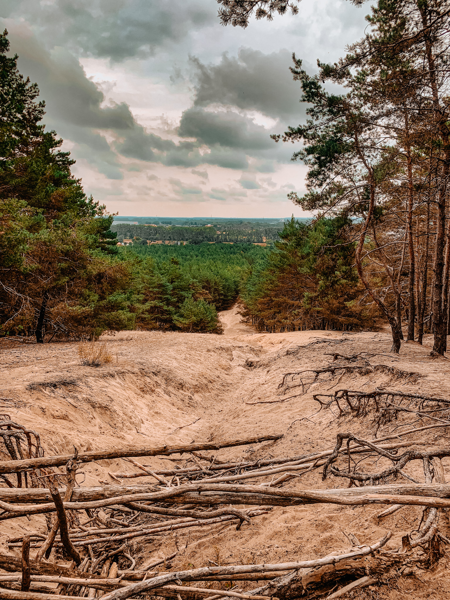 Der Abstieg erfolgt über eine, mitten durch den Kiefernwald gehende Schneise aus Sand. Hier kannst Du dich wie ein Kind vom Sand hinunter treiben lassen. Eine ziemlich spaßige Sache. Der Regen hat gigantisch tiefe und breite Furchen in den Sandberg gespült, beeindruckend.