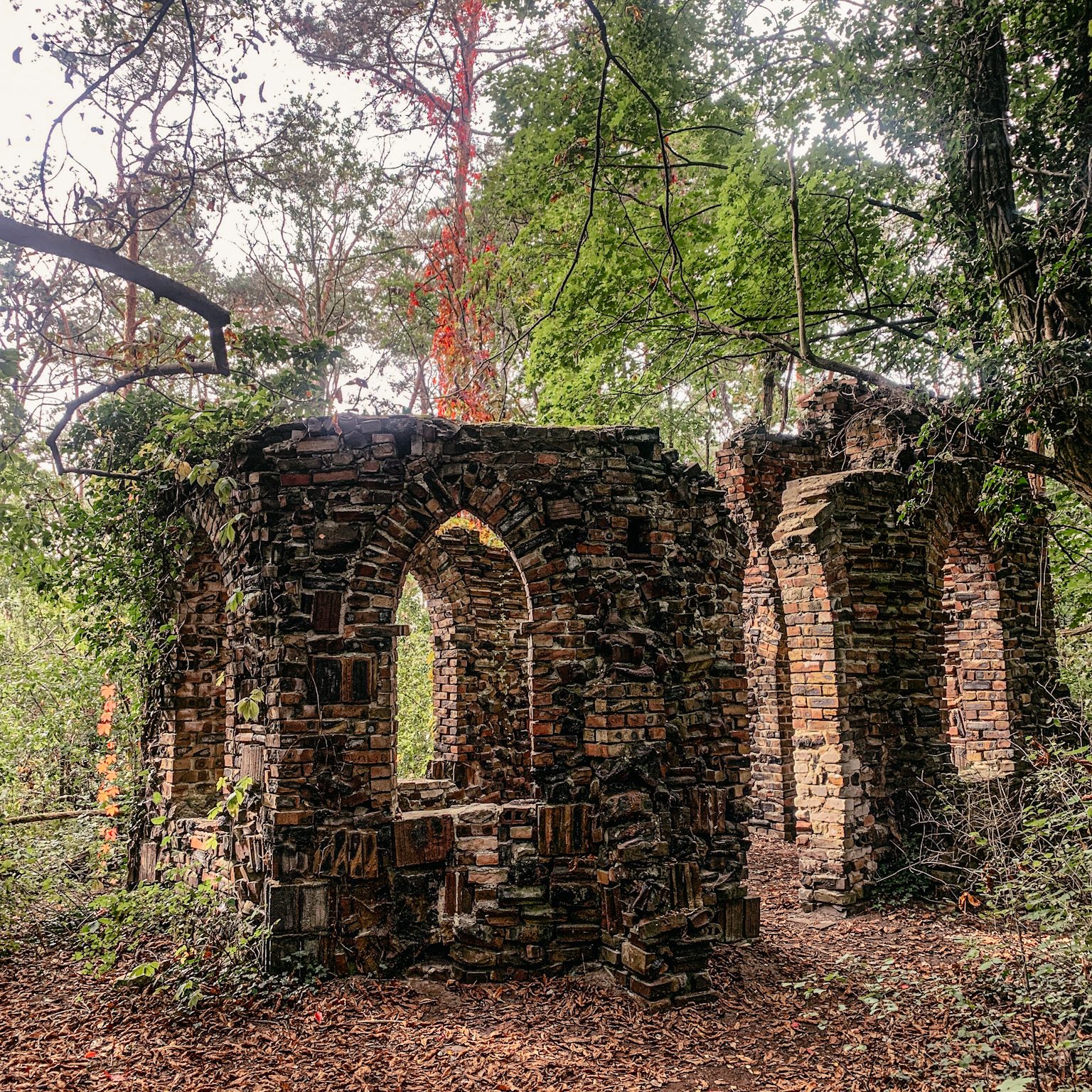 Auf dem Rückweg vom Turm geht ein Pfad rechts in den Wald ab. Er führt zu einer, ganz zwischen Bäumen versteckt, von Efeu und wildem Wein bewachsenen Ruine einer gotischen Kapelle. Die Kapelle, die nicht wirklich alt ist, wurde wahrscheinlich in den 1959er/1960er Jahren als Filmkulisse hier errichtet. Ich kann dir diesen Abstecher nur wärmstens empfehlen. Der Ort ist ein wunderschönes Lost Place und ein Fotohighlight.