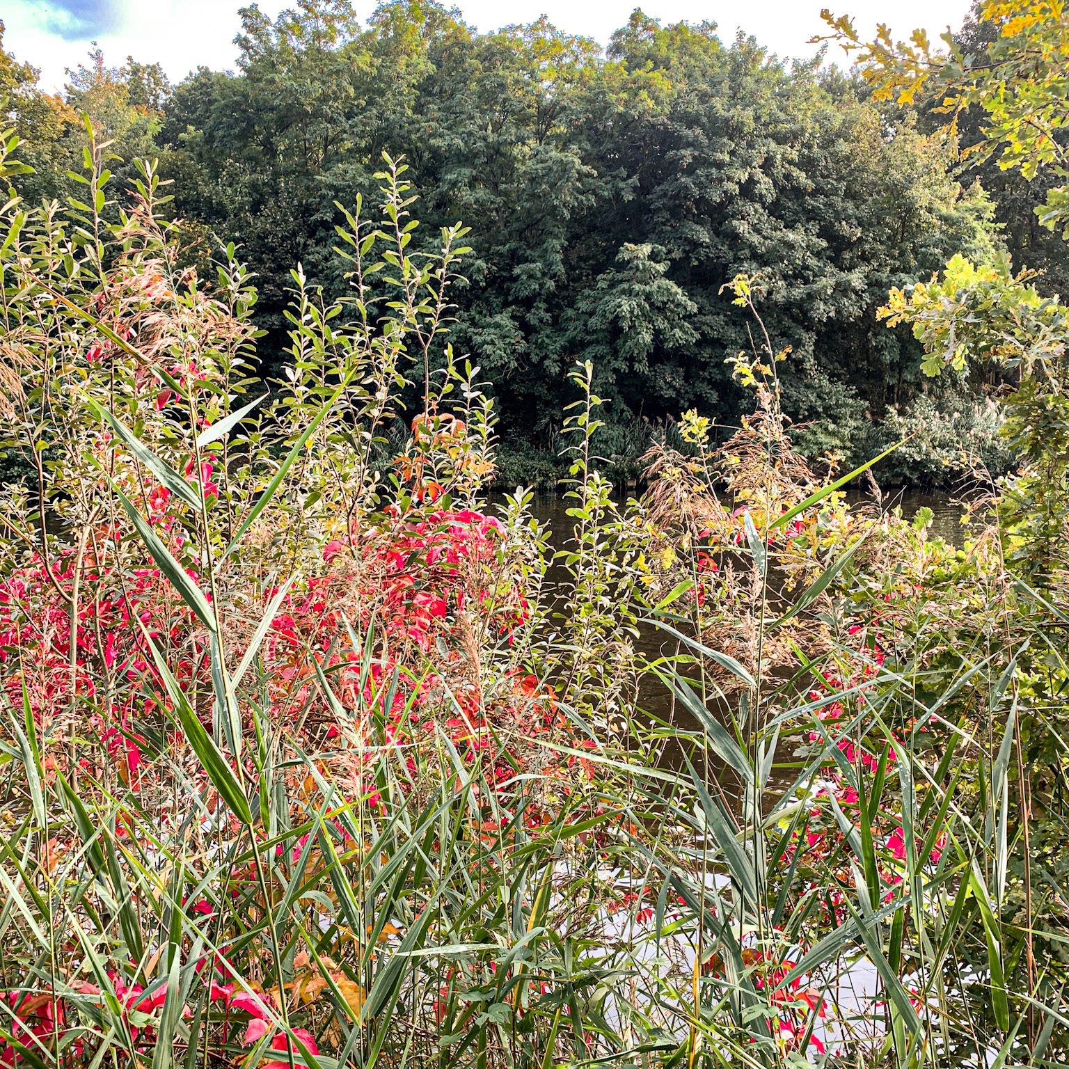 Der Weg hinunter zum See ist spannend und ganz nach meinem Geschmack. Hier und da winden sich einige Ranken des wilden Weins durch die Büsche, dessen rote Blätter mir das Nahen des Herbstes anzeigen. Unten angekommen wartet eine fantastische Aussicht auf den Machnower See bis hin zur Schleuse Kleinmachnow.