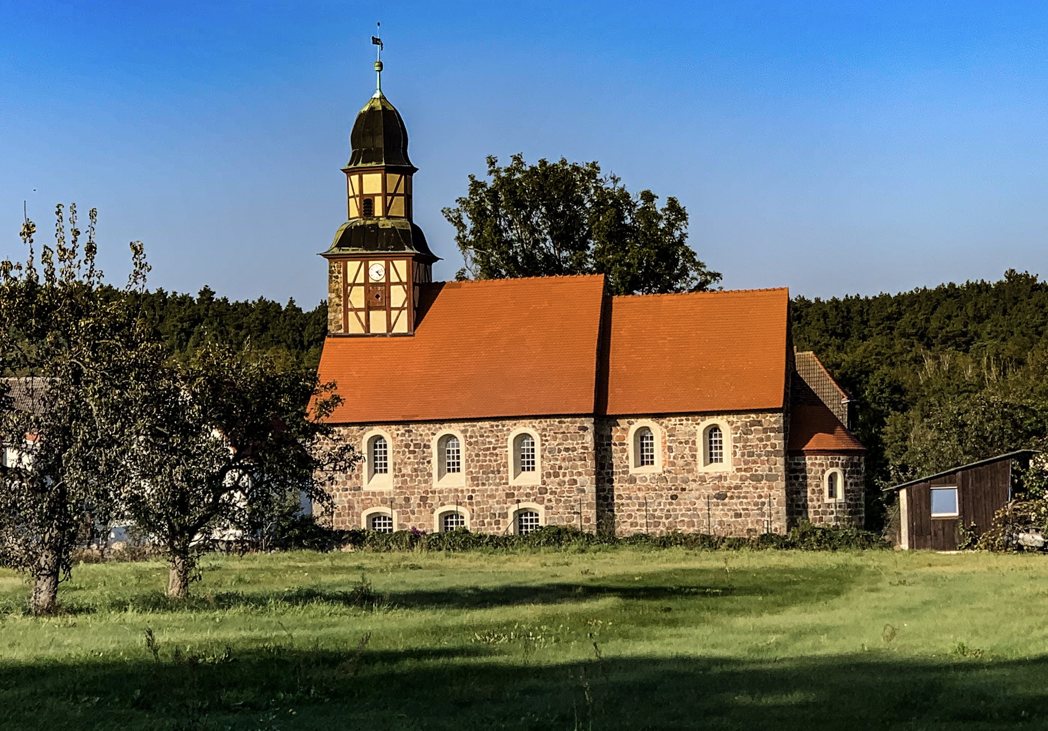 An einer Schutzhütte biegt der Wanderweg in eine Wiese ein und führt direkt über die Plane in den Ort Raben. Hier steht sie nun, die Eingangs erwähnte mittelalterlichen Dorfkirche des Ortes. Im Naturparkzentrum wurde mir nahegelegt sie unbedingt zu besichtigen und so bin ich echt gespannt, was mich drinnen erwartet.