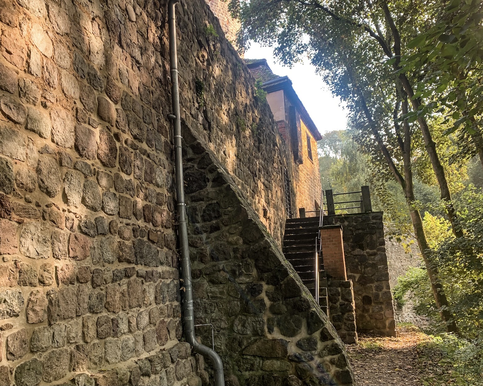 Die Burg Rabenstein, die sehr gut erhalten und restauriert ist, wurde Mitte des 12. Jahrhundert erbaut. Ich kann dir auch den Weg um die Burg herum empfehlen. Er führt dich zum kleinen Kobold im Wald und schließlich über einen weiteren Eingang zur inneren Burg. Dabei kannst du die mächtige, 1,70 Meter dicke Burgmauer, die von 18 Pfeilern gestützt wird bewundern. Durch das moosbedeckte Totholz sieht dieser Bereich besonders verzaubert aus.