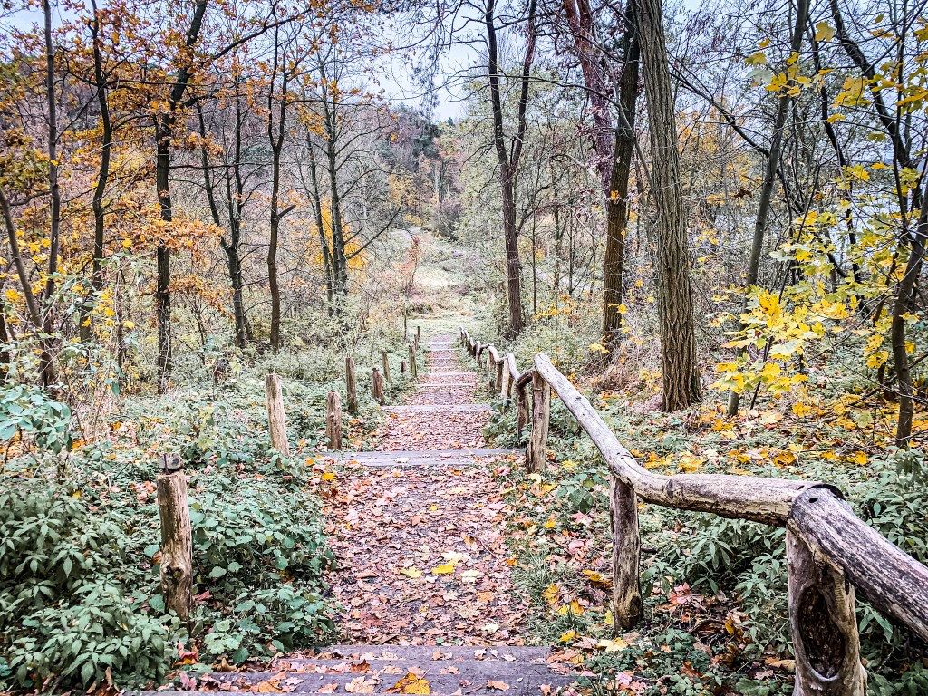 Vom Strandbad aus führt mich der Weg gemeinsam mit dem wirklich schönen Havelhöhenweg bis zur Insel Schwanenwerder, die das Ende des Großen Wannsees und den Übergang zur Havel markiert. Eine Infotafel an der Brücke klärt über die wechselhafte Geschichte der einst Sandwerder genannten Insel auf. Ich beschließe mir den Abstecher zu sparen. Ab jetzt trennt sich der Havelseenweg vom Havelhöhenweg, ich folge dennoch letzterem, intuitiv und ich tue gut daran. Der Havelhöhenweg führt mich auf einer abwechslungsreichen Route oberhalb der Havel, auf der eiszeitlichen Grundmoränenplatte des Teltow entlang. Der herbstliche Wald, Aussichtspunkte, teils Treppen, Serpentinen und steile Abstiege machen mir richtig viel Spaß.