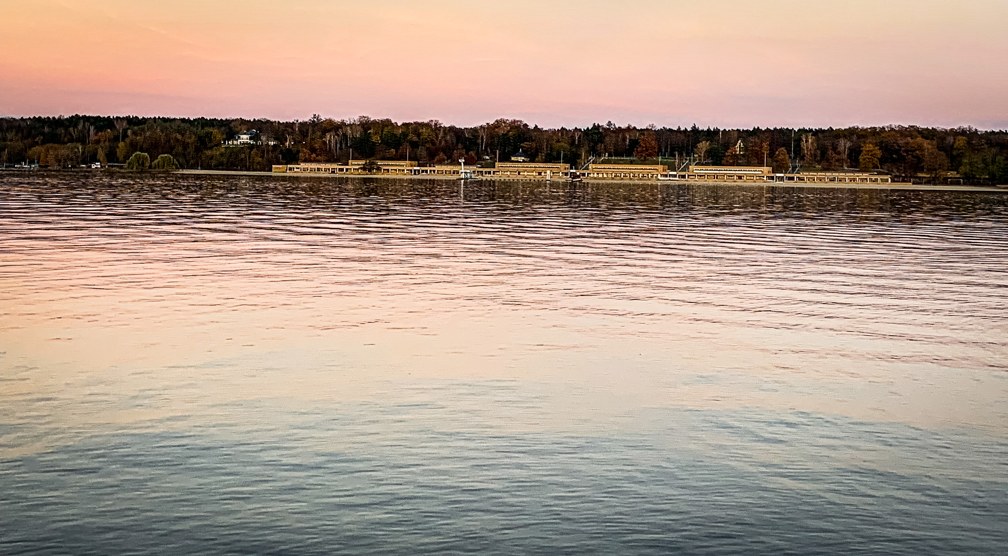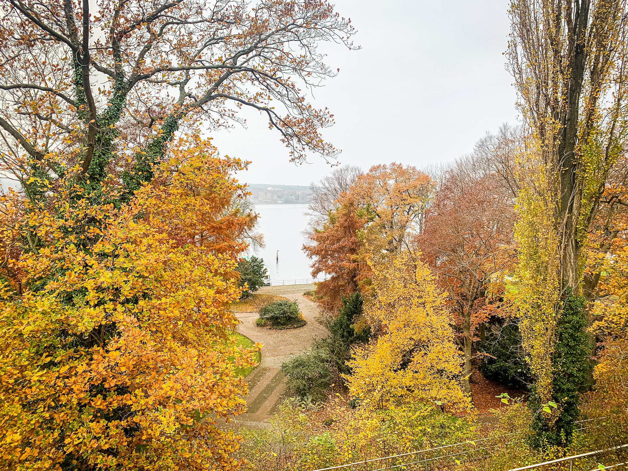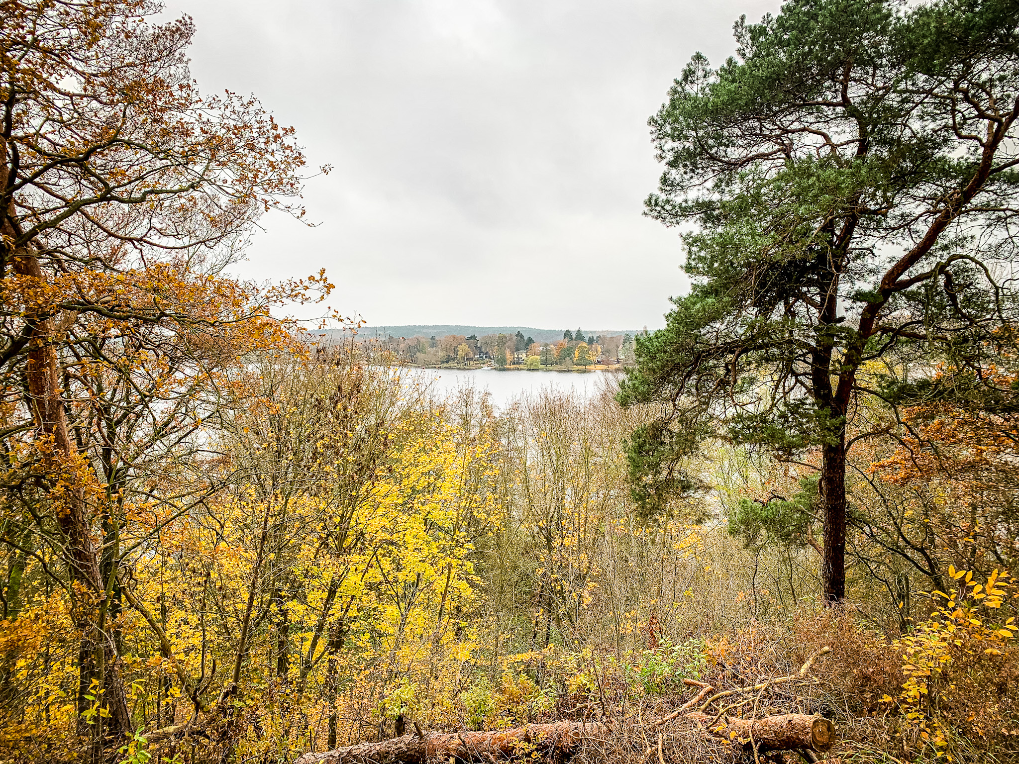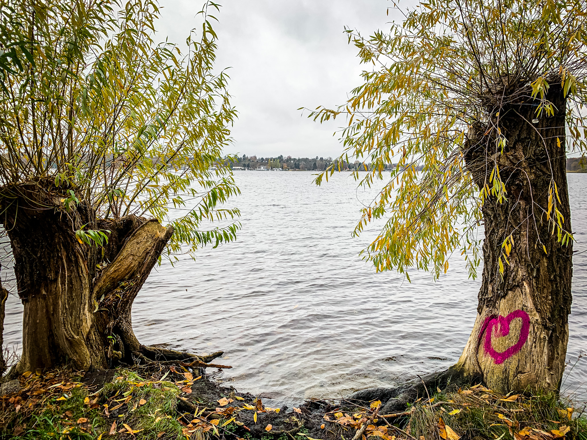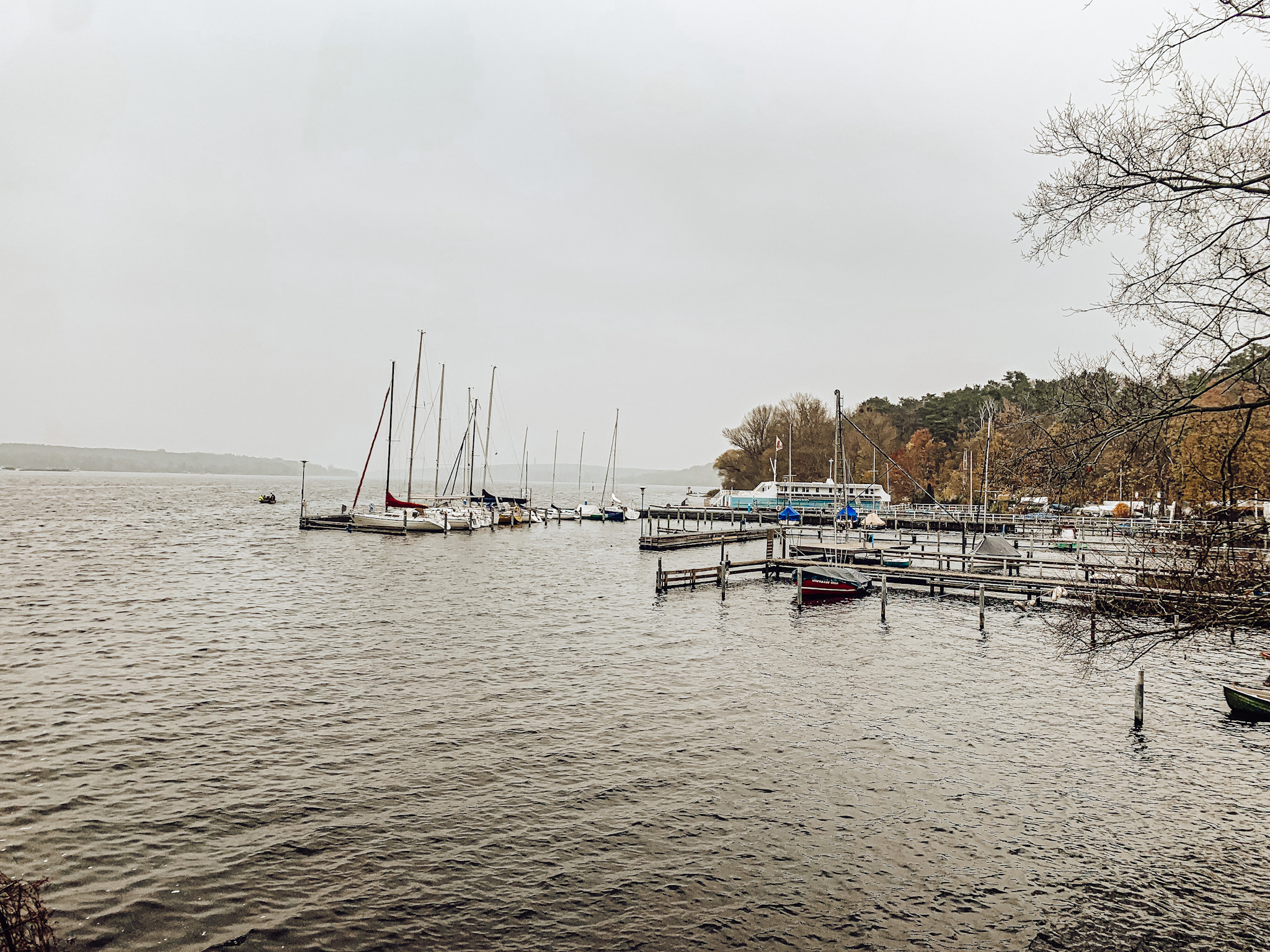 Im November kann man Glück oder Pech haben mit dem Wetter, meines lag genau dazwischen. An diesem stürmisch trüben Novembertag, die Havel in milchiges Licht getaucht, die bunten Blätter der Buchen am Hang in krassem Kontrast dazu, zog ich los, um den Havelseenweg zu erkunden. Er sollte der letzte auf meiner Berlins Wege am Wasser Challenge sein, die ich mir in den Kopf gesetzt hatte und mit dem Teltowkanalweg begonnen, über den Dahmeweg fortgeführt und zuletzt mit dem mir immer noch liebsten Wannseeweg schon als beendet glaubte. Der Havelseenweg war nicht geplant, ich hatte ihn nicht mal auf dem Schirm, er ergab sich einfach aus dem Wannseeweg gepaart mit meiner Freude an der Uferkriecherei. Ob man wohl auf der anderen Seite auch am Wannsee entlang laufen kann und wo fließt diese riesige Havel eigentlich hin? Und überhaupt war ich tatsächlich noch nie zuvor am berühmten Strandbad Wannsee gewesen. Mit diesen Impulsen wäre ich auch auf eigene Faust los gezogen doch praktischerweise gibt es da den Grünen Hauptweg 12, der dieser Route, oft gemeinsam mit dem Havelhöhenweg folgt.