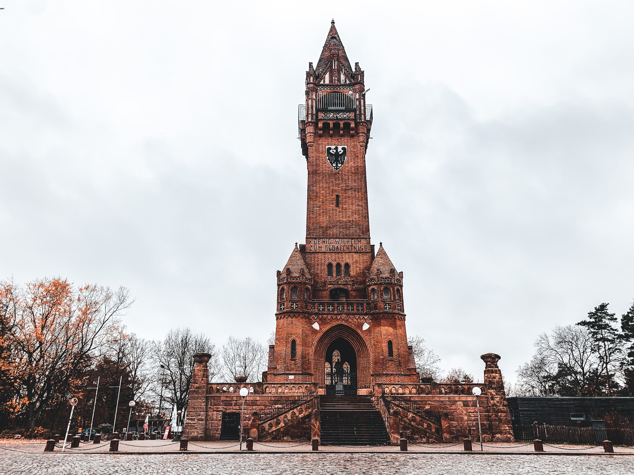 Nach einer gefühlten Ewigkeit führt ein nicht gekennzeichneter Weg den Hang hoch. Dank meiner Karte weiß ich, dass es hier zum Grundewaldturm geht und diesen empfehle ich dir unbedingt zu besuchen. Über Treppen und steinige Pfade geht es ziemlich steil, für Berliner geradezu alpin, bergan. Oben erwartet mich der 55m hohe Backsteinturm aus dem 19. Jahrhundert, der einst zu Ehren Kaiser Wilhelm des Ersten errichtet wurde. Die Aussichtsplattform kann gegen Gebühr erklommen werden, von oben ist der Blick über den Wald und die Havel spektakulär.