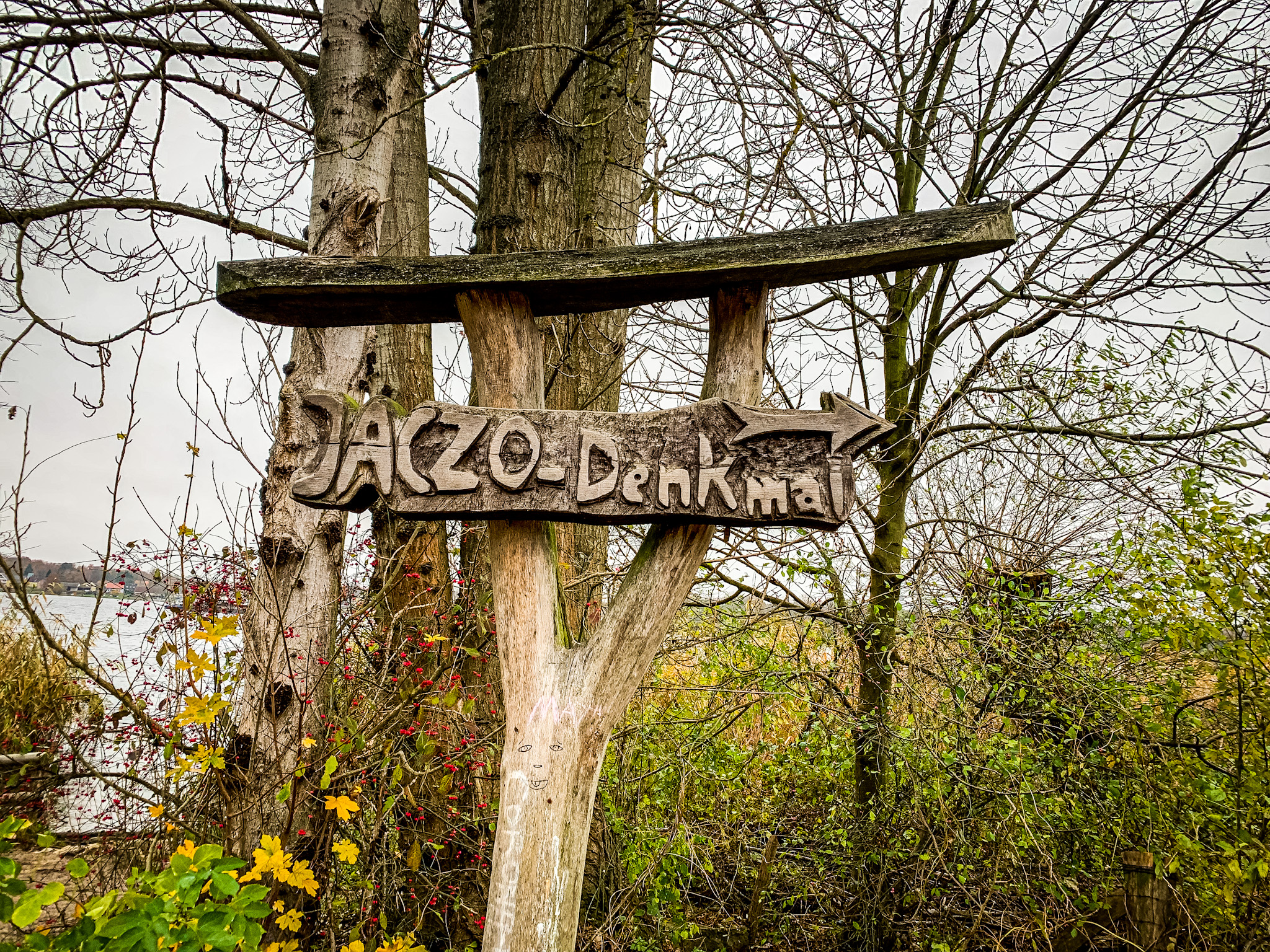 Am nächsten Tag geht es weiter, bei gleichem Wetter, am naturnahen Havelstrand entlang bis zur Halbinsel Schildhorn. Der mittlere Weg führt über Treppen zum höchsten Punkt der einem männlichen Körperteil ähnlichen Landzunge. Dort oben steht das Denkmal für den Slawenprinzen Jaczo. Die Geschichte ist wie üblich keine rühmliche, ich genieße lieber den Ausblick. Der flache Sandstrand an der Spitze der Halbinsel ermutigt mich ein paar Schritte ins eiskalte Wasser zu wagen, dieses Ritual hab ich mir angewöhnt, es verwöhnt meine Wanderfüße und der alte Kneipp meinte ja schon, dass es gesund sei.