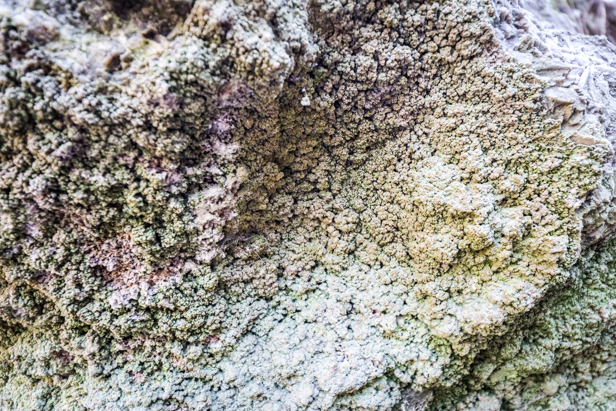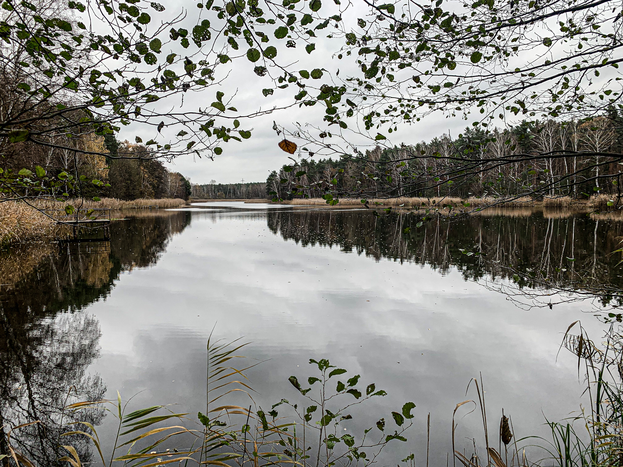 Zwischen baumbestandenen Hängen hindurch folge ich dem mit feuchten Blättern gepolsterten Weg. Plötzlich taucht zu meiner Linken ein See auf, an dessen Seite sich eine Wand aus Stein und ockerfarbener Erde aufbäumt. Die Stimmung in diesem diffusen Licht ist magisch.