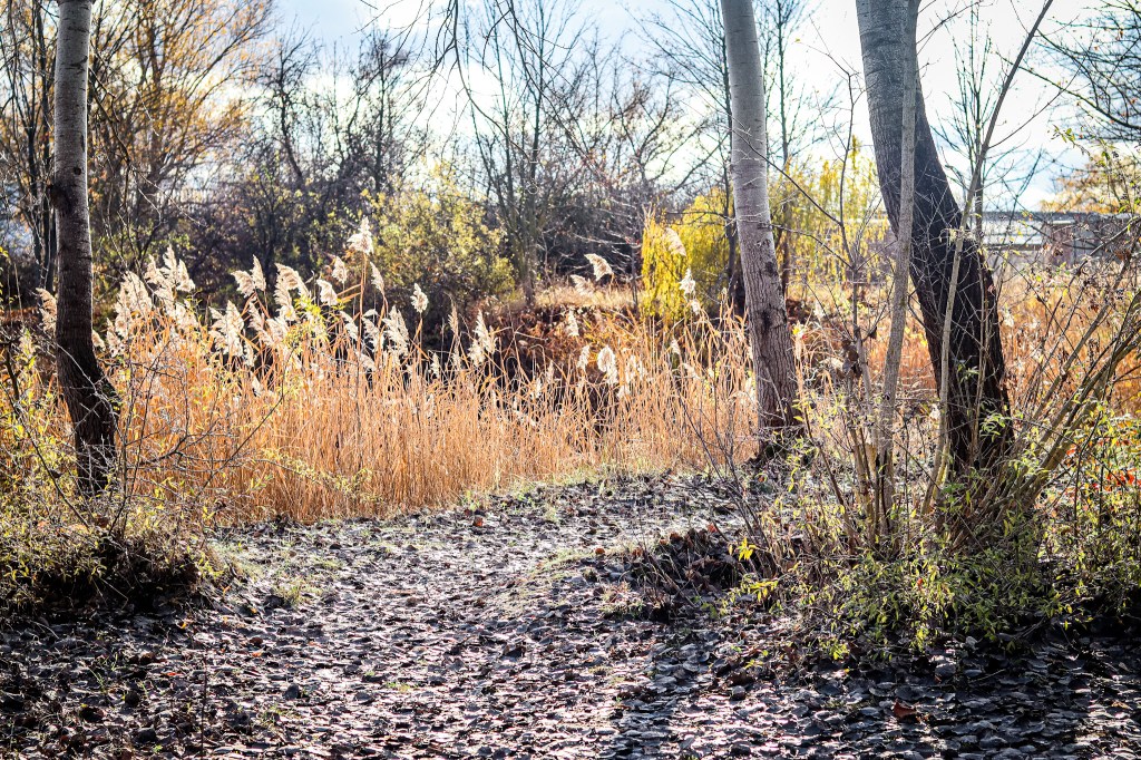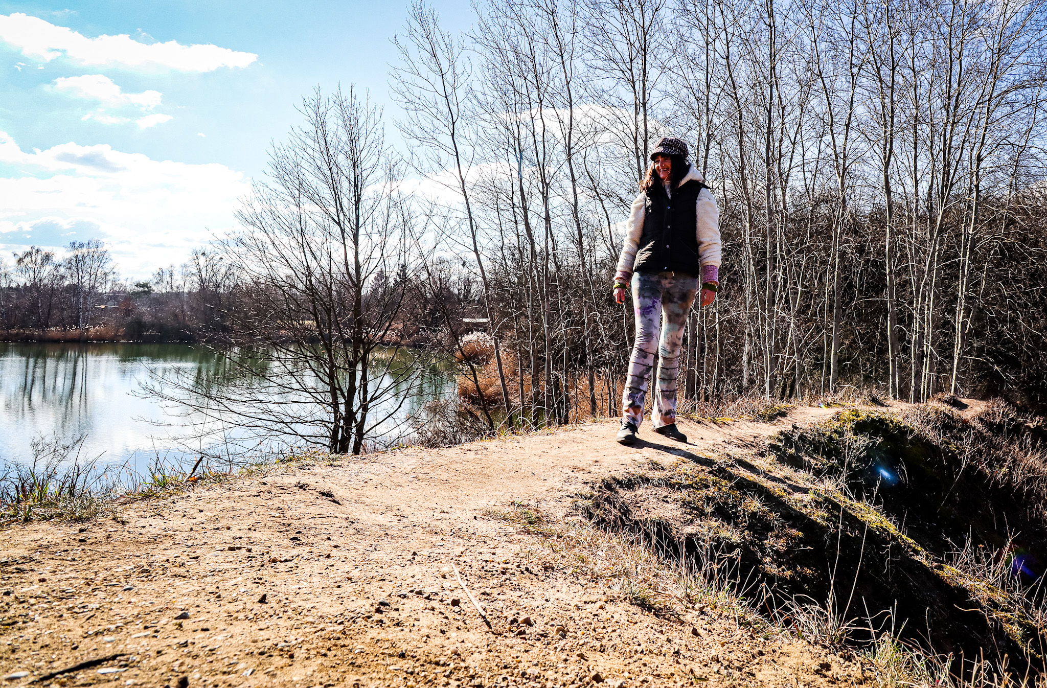 Ich stehe vor Tiefbausee Nummer 1, wie ich wenig später an einer weiteren Tafel des Boden Geo Pfades lese. Mittig liegt eine kleine, bewaldete Insel, auf der einst ein Turm für die Drahtseilbahn stand, mithilfe derer Gips zur Wäscherei gebracht wurde. Zwei Enten, von mir aufgescheucht, flüchten eilig hinüber und verschwinden im dichten Schilf. Ich betrachte das Szenario eine Weile still und staune wieder einmal, wie schnell sich ein Landschaftsbild innerhalb weniger Meter so verändern kann.
