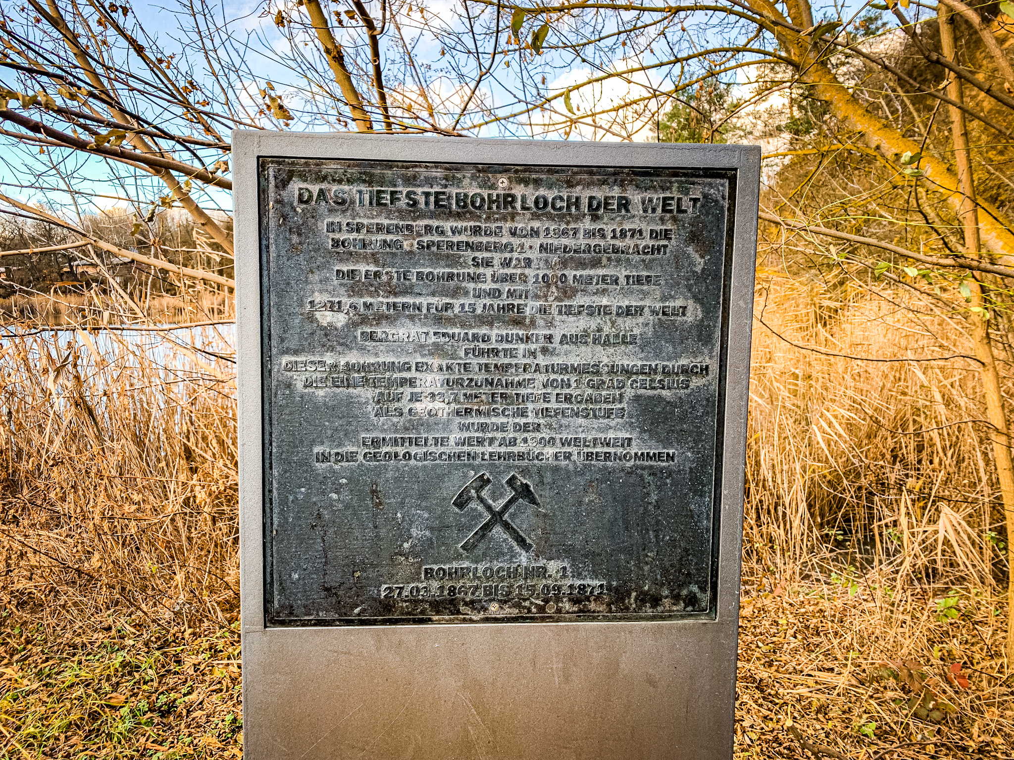 Tour 2 ca. 5 Kilometer ➸ Auf Tour 2 wähle ich mir den traumhaften Panoramaweg aus, der an der Abbruchkante entlang führt und den Blick von oben auf die Tiefbauseen und das umliegende Land freigibt. Ich kombiniere die recht kurze Strecke mit einer kompletten Umrundung des Faulen Luchs und dem Rückweg zu Tiefbausee 2 wo das einst tiefste Bohrloch der Welt auf mich wartet. Der See ist nicht zu verfehlen, da es schon von weitem nach Schwefel stinkt wie die Hölle. Eine Stehle klärt mich auf, dass 1867 bis 1871 an dieser Stelle die erste Tiefbohrung der Welt auf über 1000 Meter abgeteuft wurde. Auf den 1271,6 Metern wurde die Salzschicht nicht durchstoßen, außerdem konnte erstmalig wissenschaftlich belegt werden, dass die Temperatur alle 100 Meter um 3 Grad Celsius steigt. Die sogenannte geothermische Tiefenstufe galt von da an weltweit. Auch dieser Weg bekommt meinen 👍🏻