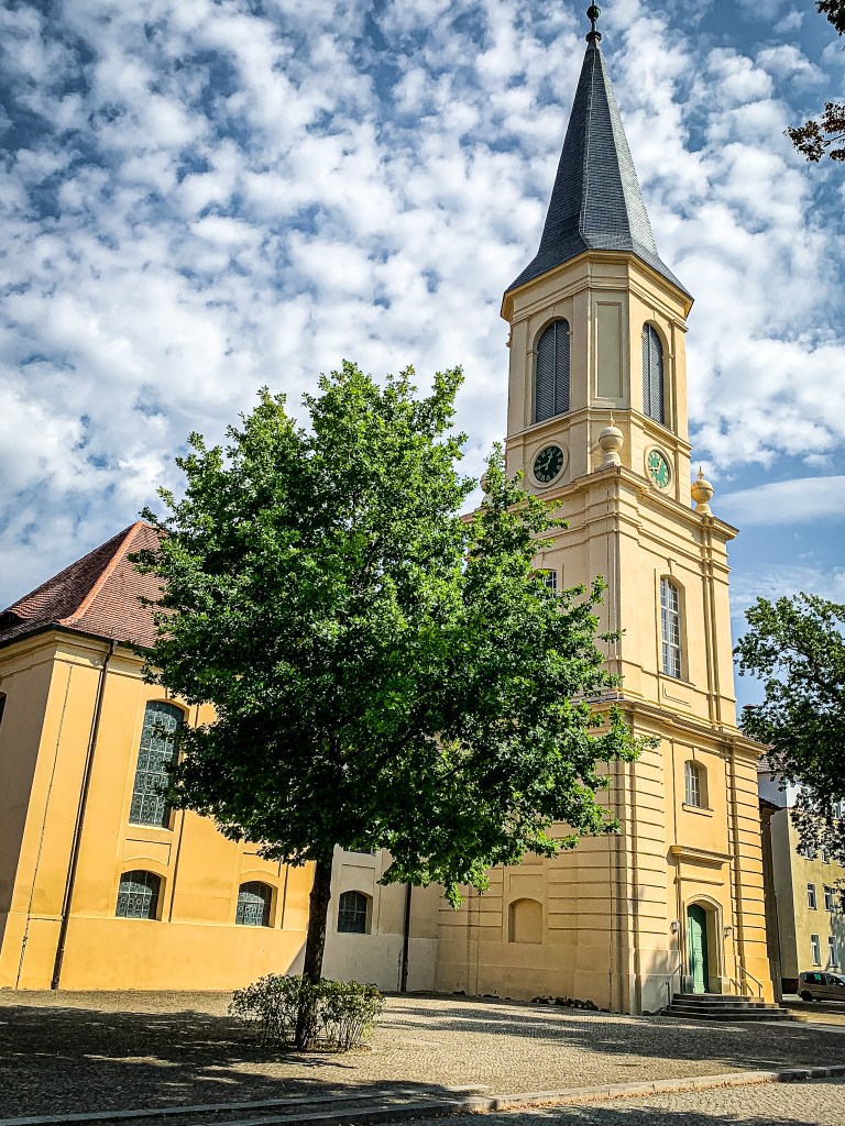 Nach meinem Besuch im Café sehe ich mir den historisch interessanten Kirchplatz an. Restaurierte Häuser, unter anderem das aus 1746 stammende Predigerhaus, in dem heute die Stadtbibliothek zu Hause ist, säumen die imposante Dreifaltigkeitskirche, die in einem schönen Sandsteingelb erstrahlt. Ich folge dem Marktplatz und biege in die pittoreske Marktstraße ein, in der die mittelalterliche Geschichte nicht zu verleugnen ist.