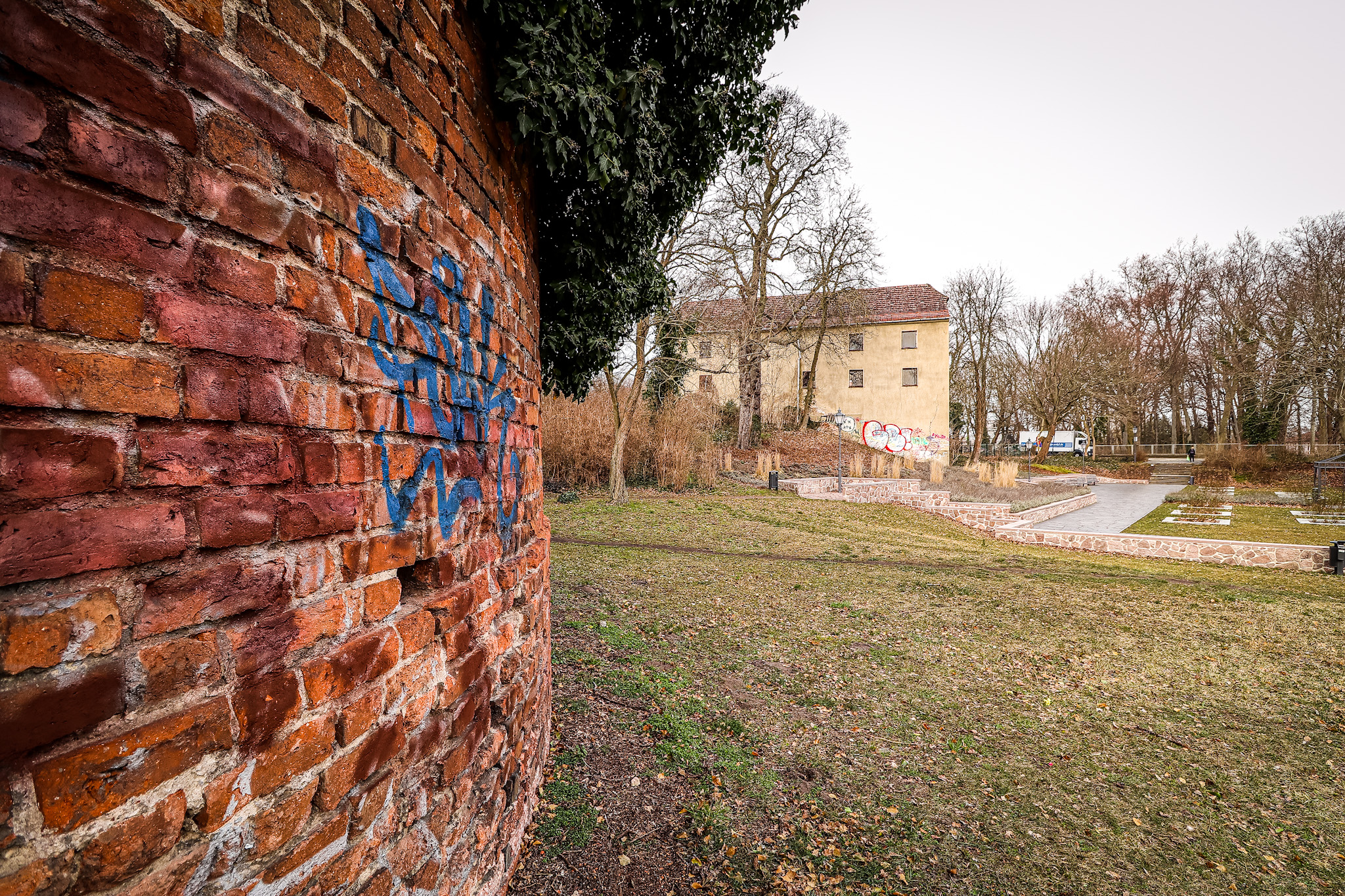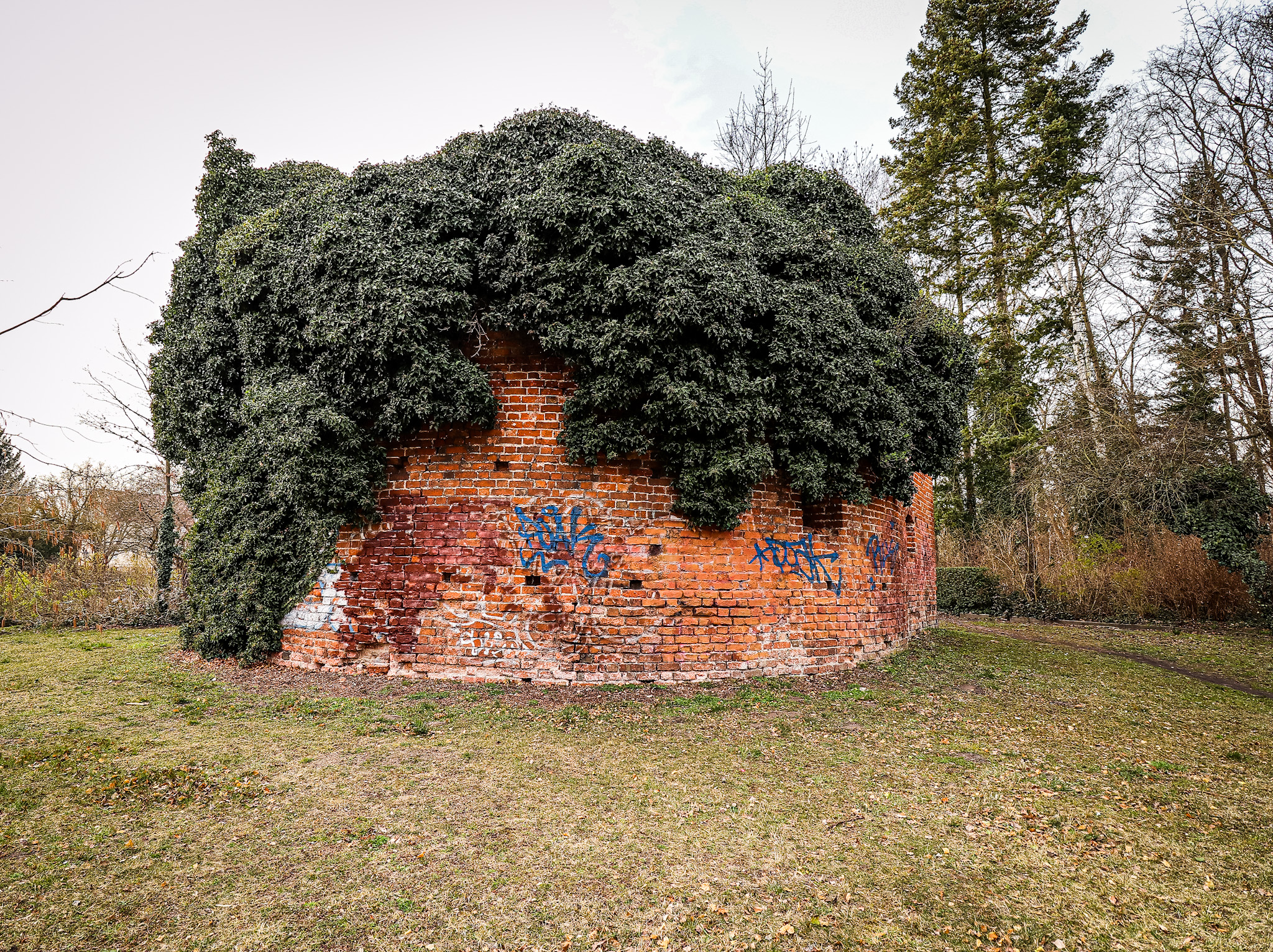 Mein erstes Ziel in Zossen ist die im heutigen Stadtpark liegende Wasserburg aus dem 13./14. Jahrhundert. Auf einer Anhöhe gelegen entdecke ich die Überbleibsel der Bastion, die im 13. Jahrhundert vermutlich auf den Resten einer slawischen Burg errichtet wurde. Efeu rankt sich an den dicken Ziegelmauern empor. An den wenigen freien Stellen sind deutlich die Schießscharten der ehemals zweigeschossigen Anlage zu sehen.