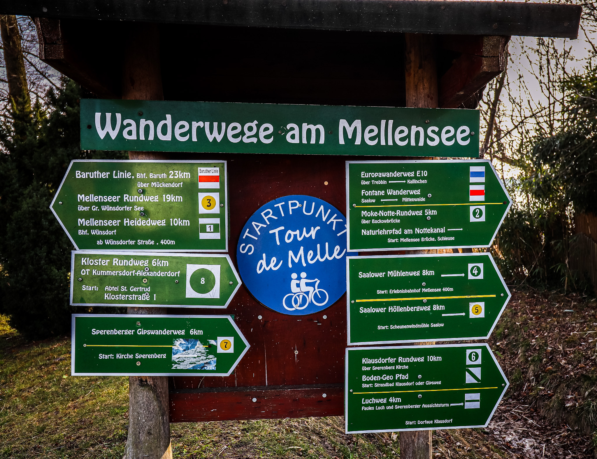 Der Verein pro Mellensee ist sehr aktiv im Wanderwege erschließen und so steht am Zugang zum See neben überdachten Rastplätzen auch eine üppig bestückte Tafel sämtlicher Wanderwege der Gegend. Die Auswahl ist gut sortiert, könnte man sagen.
