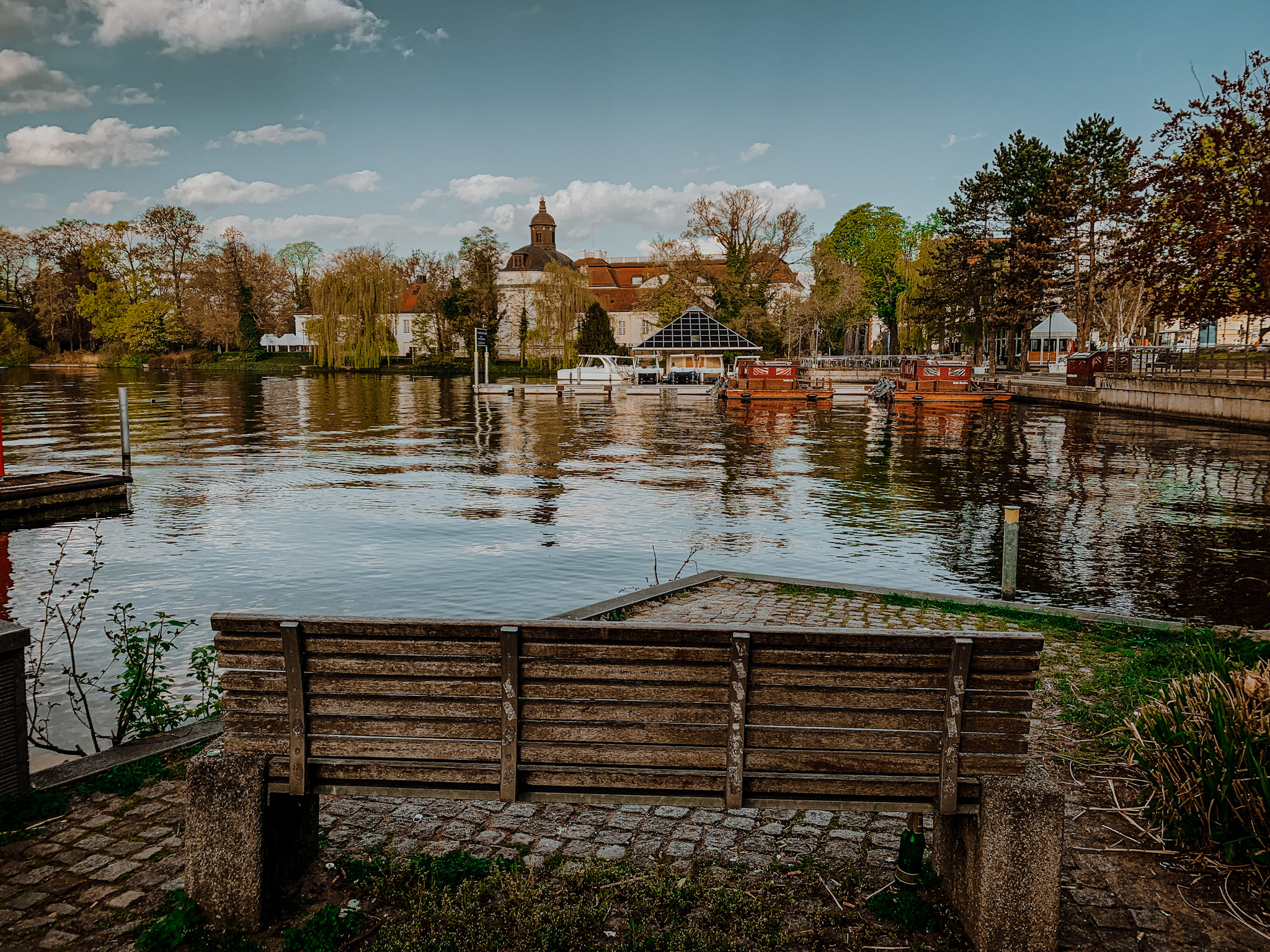 Der Uferweg geht nah am Wasser entlang und gibt den Blick auf das Kiez, die Köllnische Vorstadt und Spindlersfeld frei. In der Mitte befindet sich eine Freifläche, von der du einen schönen Blick auf das barocke Schloss hast.