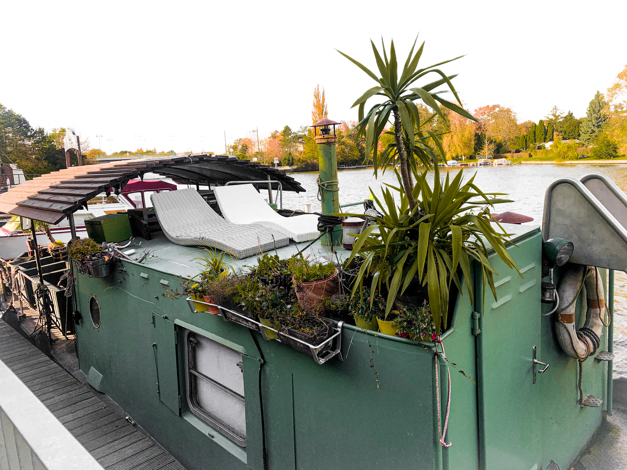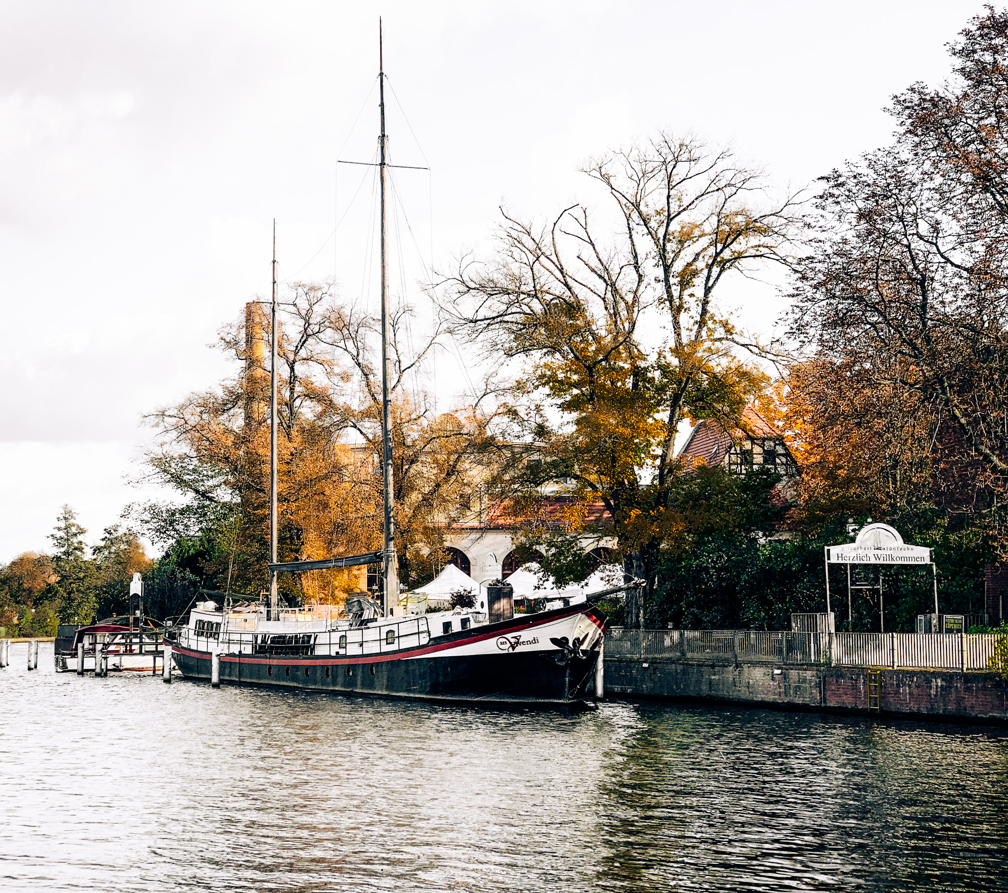Auf diesem Weg gibt es mehrere Panorama Fotospots, alte Fabrikarchitektur, die restauriert und in Wohnraum umgewandelt wurde, das Partyschiff Ars Vivendi und das Ausflugslokal Freiheit 15 zu sehen. Unter der Dammbrücke hindurch stehst du nun am Zusammenfluss von Müggelspree, Dahme und Spree. Auch von hier hast du einen spektakulären Blick.