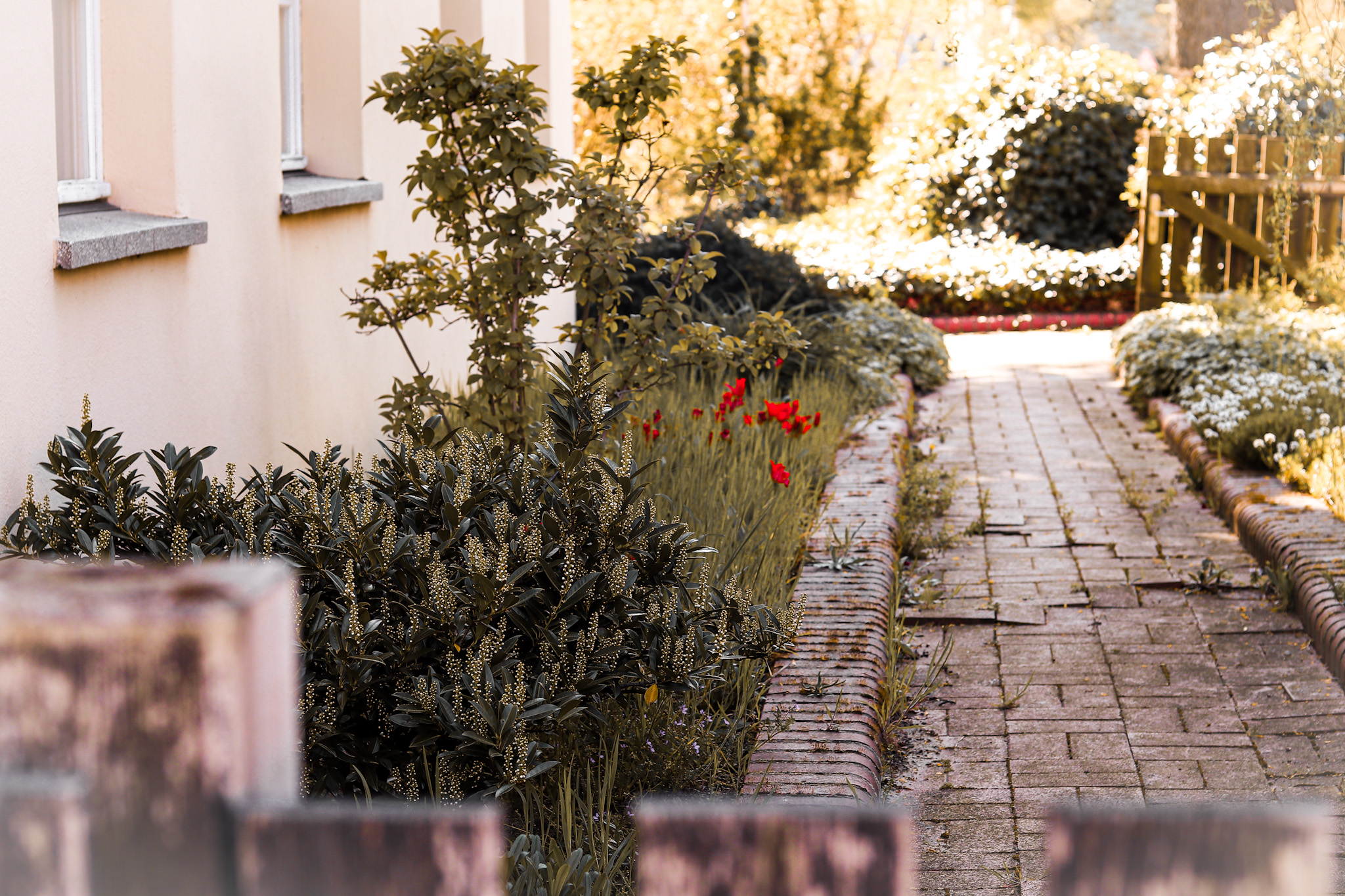 Durch den alten Baumbestand ist im hinteren Teil ein schöner Waldgarten entstanden, mit idyllischen Pfaden und Bänken zum verweilen. Zum Schlosshof hin schließt sich ein Staudenbeet und ein formaler Garten an.