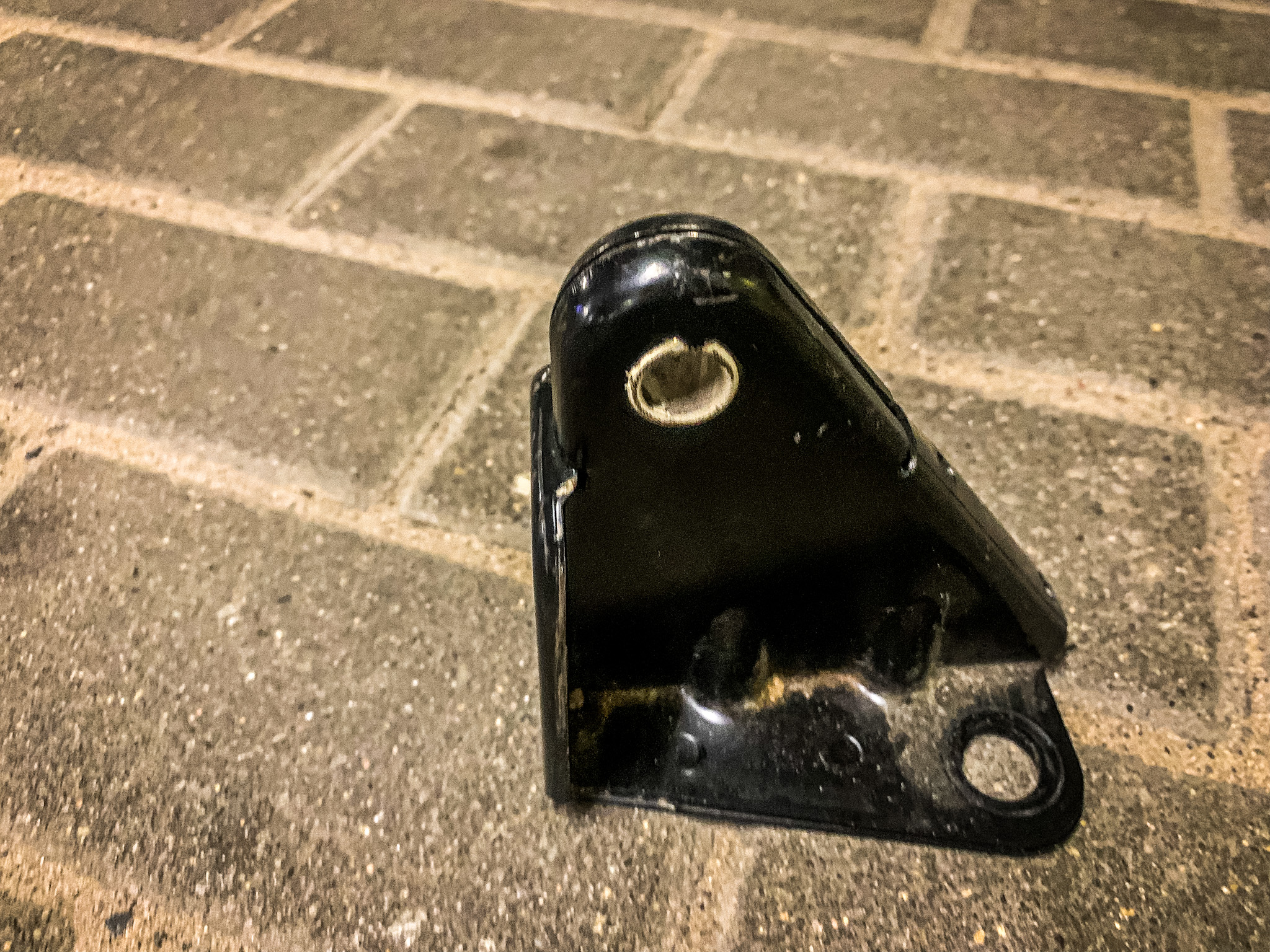 Ich schneide also den Teppich seitlich ein, biege ihn ein wenig zurück und sehe die Schraube. Auf jeder Seite des Dreiecks gibt es eine. Als Werkzeug benötige ich ein Teppichmesser und eine 16mm Nuss.
