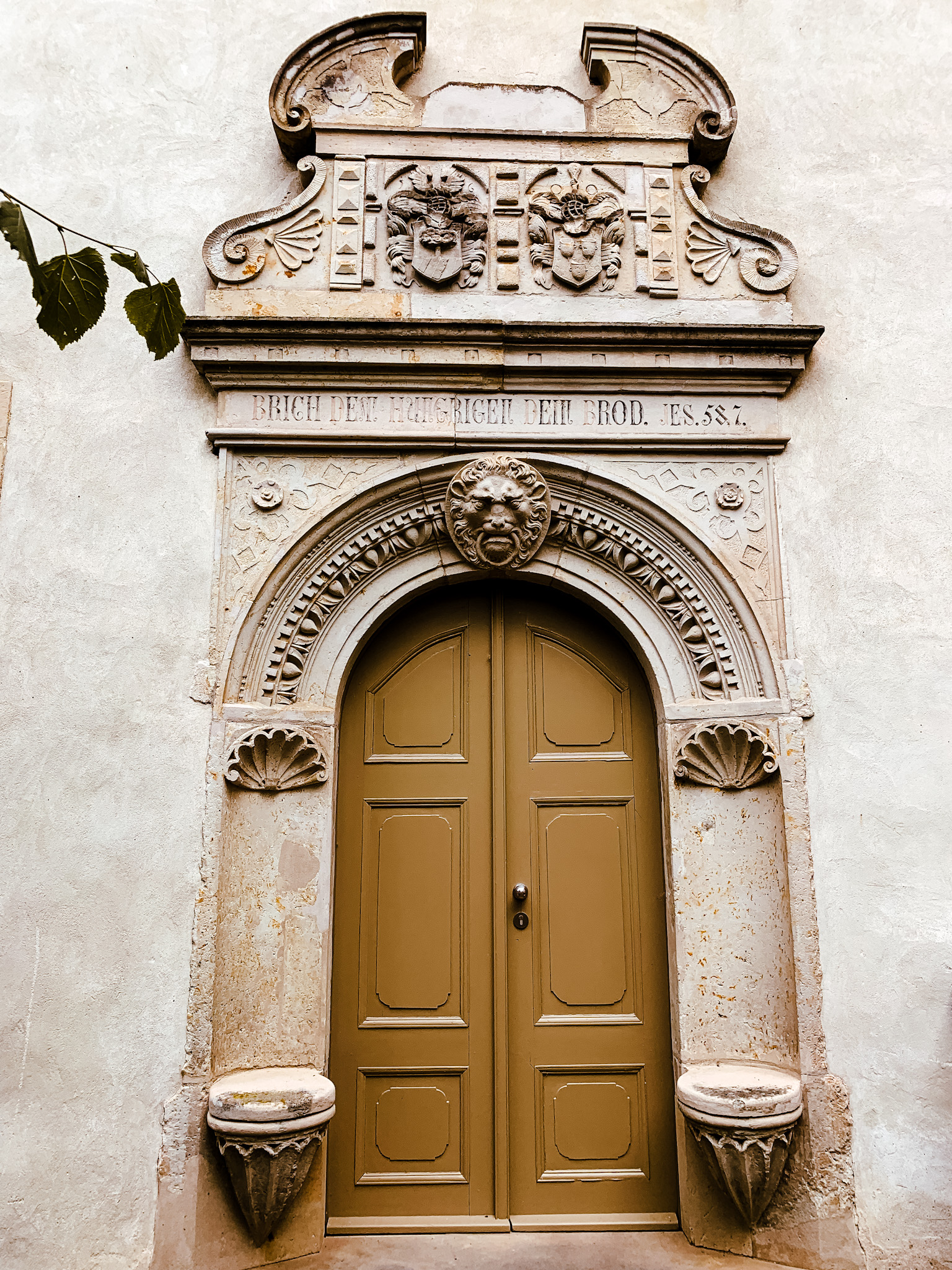 Innenhof – Im Schloss befinden sich private Wohnungen und Büroräume, um Respekt vor der Privatsphäre wird gebeten wenn man den Innenhof besichtigen möchte. Besonders schön finde ich das Brunnenhäuschen umgeben von Lavendel und Rosen. Die Eingangsportale, zum Teil mit Sitznischen, sind geschmückt mit Wappen und Innschriften.