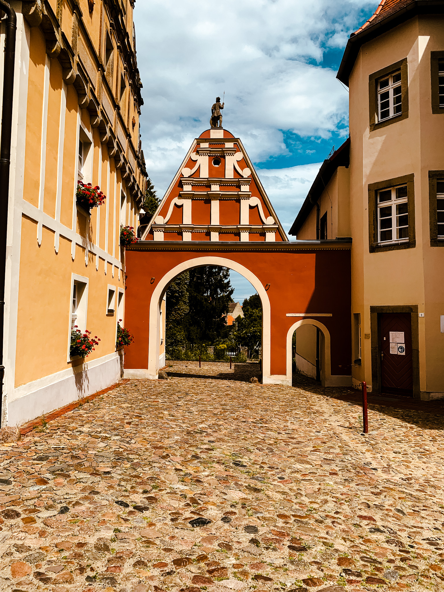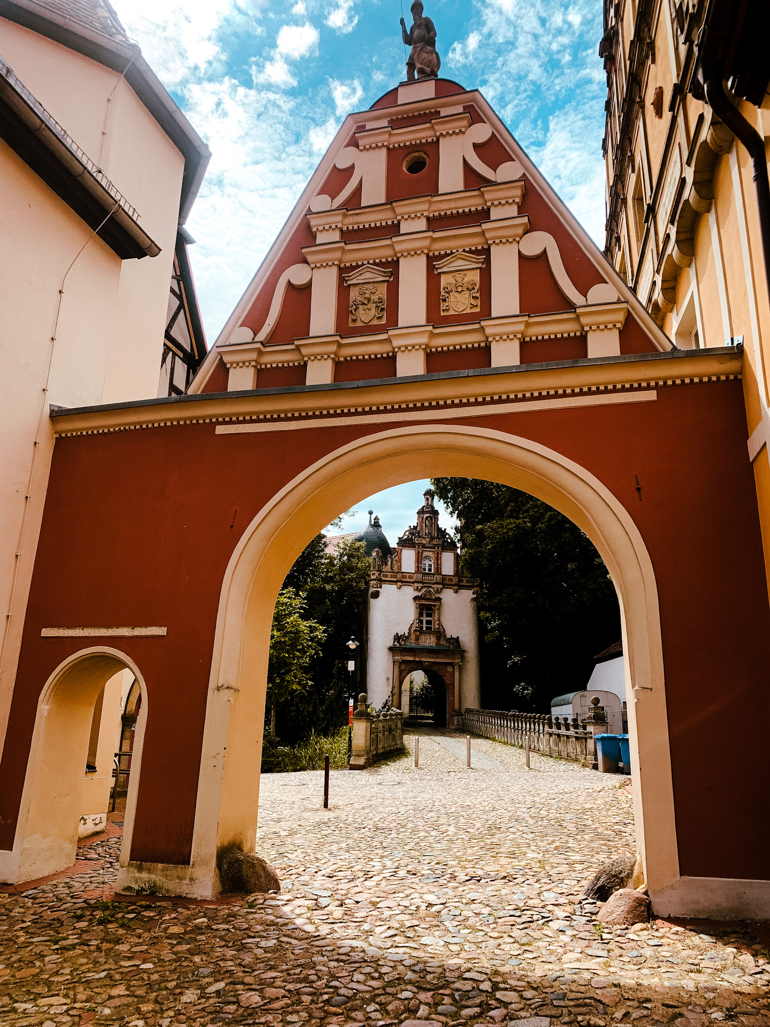 Torhaus und Innenhof – durch das um 1250 erbaute Torhaus, welches 1717 im barocken Stil umgebaut wurde, gelangst du in den Turm, die Folterkammer und den inneren Hof. Letzterer ist flankiert von verschiedenen Gebäuden, einer Freitreppe und einem weiteren schmiedeeisernen Tor. In einem der Gebäude wartet die Rabenschänke, in der es keine gebackenen Raben, dafür einen kleinen Imbiss und leckeren hausgemachten Kuchen gibt. Ich habe hier schon oft einen Milchkaffee geschlürft und es mir inmitten der alten Steine gut gehen lassen.