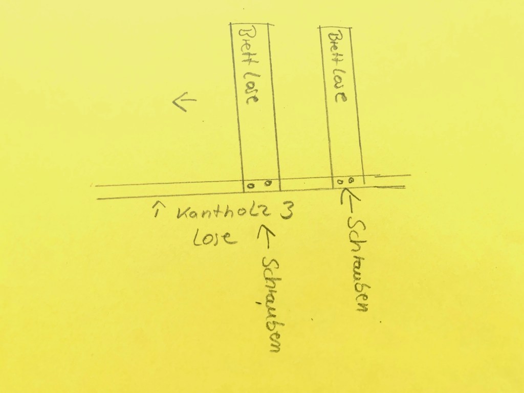 Die festen Bretter werden zum Raum hin auf ein Kantholz geschraubt, das nicht mit der Kiste verbunden ist und hinten, an der Wand mittels Scharnier an ein dort fest mit der Kiste verbundenes Kantholz montiert. Wichtig ist hier nur, bei Innenlage der Scharniere, also das Scharnier liegt unter dem Brett, einen Schwenkabstand zur Wand zu lassen. Dieser ist so breit wie das Kippmaß des Brettes. 👉🏻 Siehe Bild 2