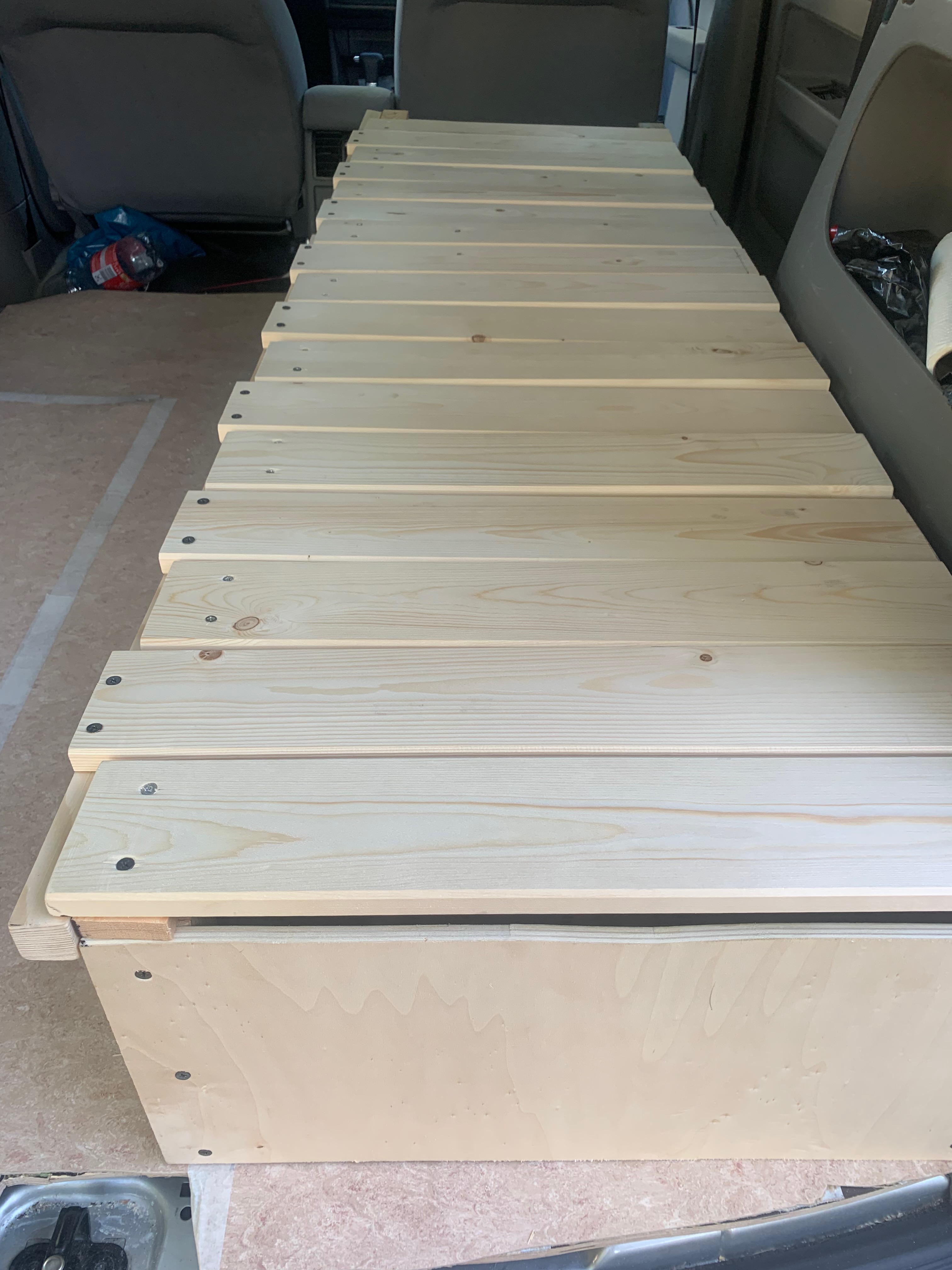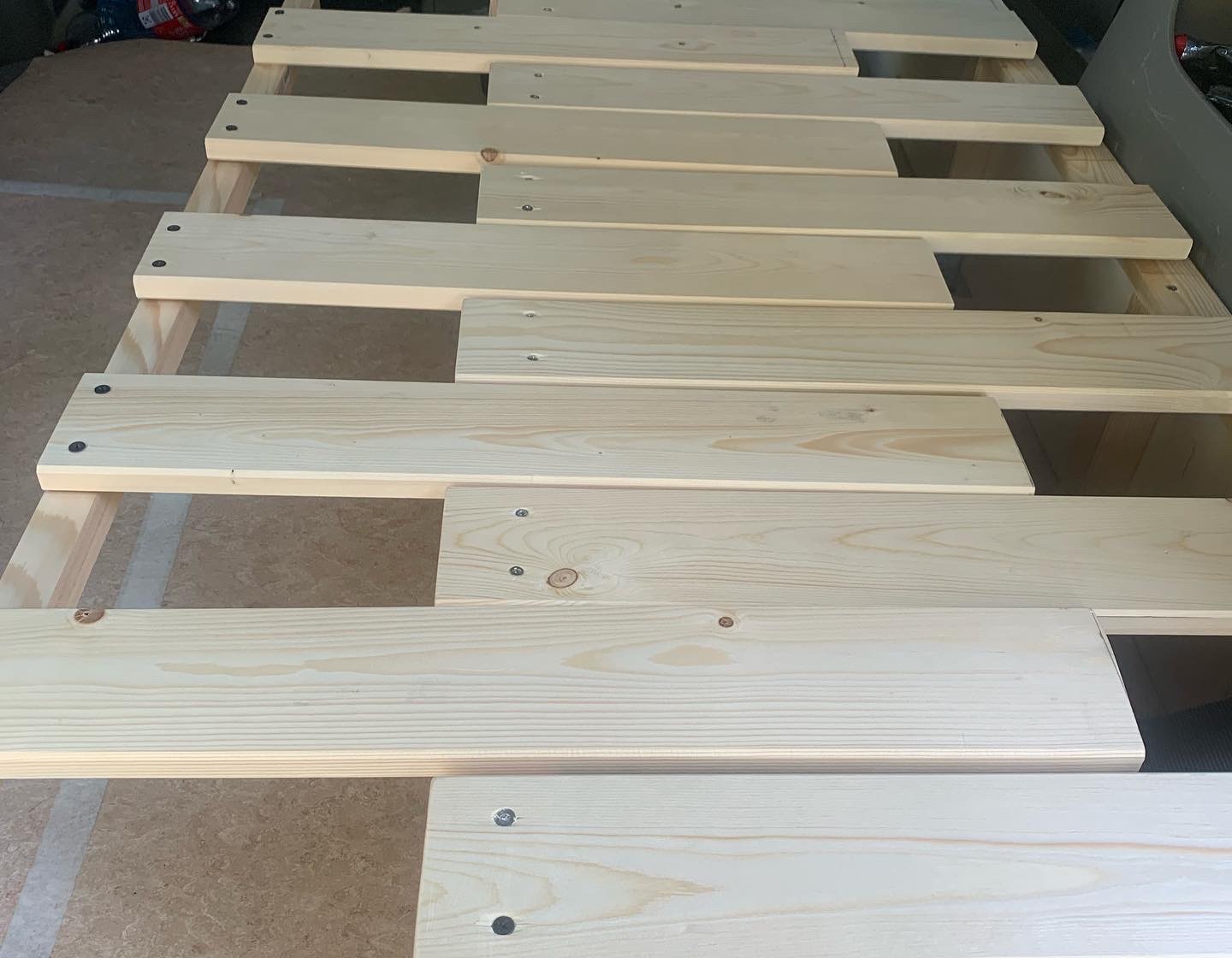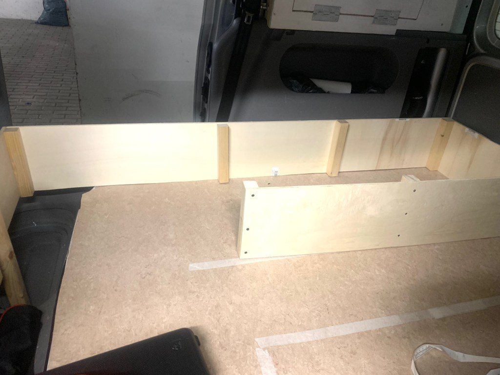 Meine Kiste ist 24cm hoch ohne Lattenrost, da ich 1,80 cm groß bin. Sie in einem Teil gebaut und hat 2 Abteile, das erste geht bis zum Ende der späteren Küche.