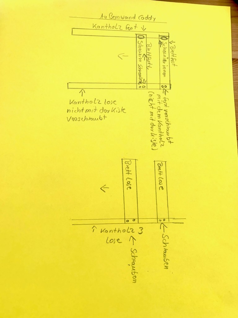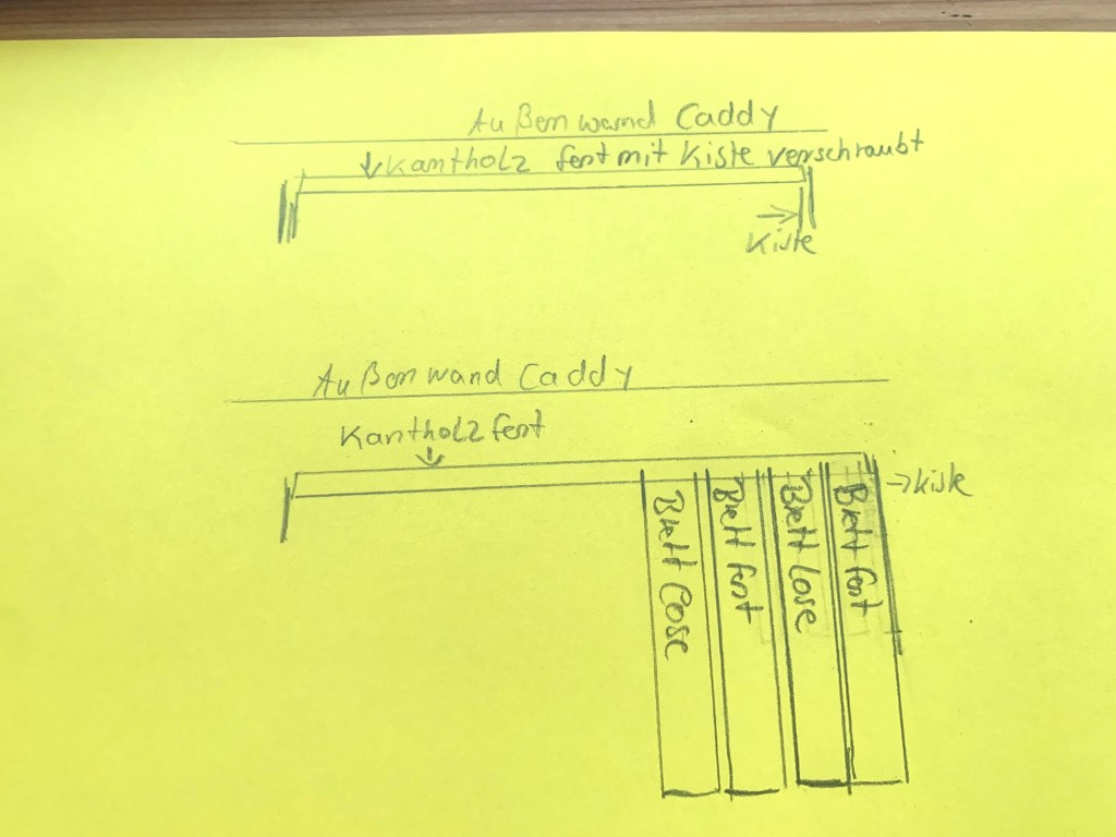 In den Zeichnungen ist ein Abstand zwischen Caddy Außenwand und Kantholz. Der ist in echt nicht dort, den brauchte ich nur für’s bessere beschriften. Du kannst dir die Bilder vergrößern und abspeichern.