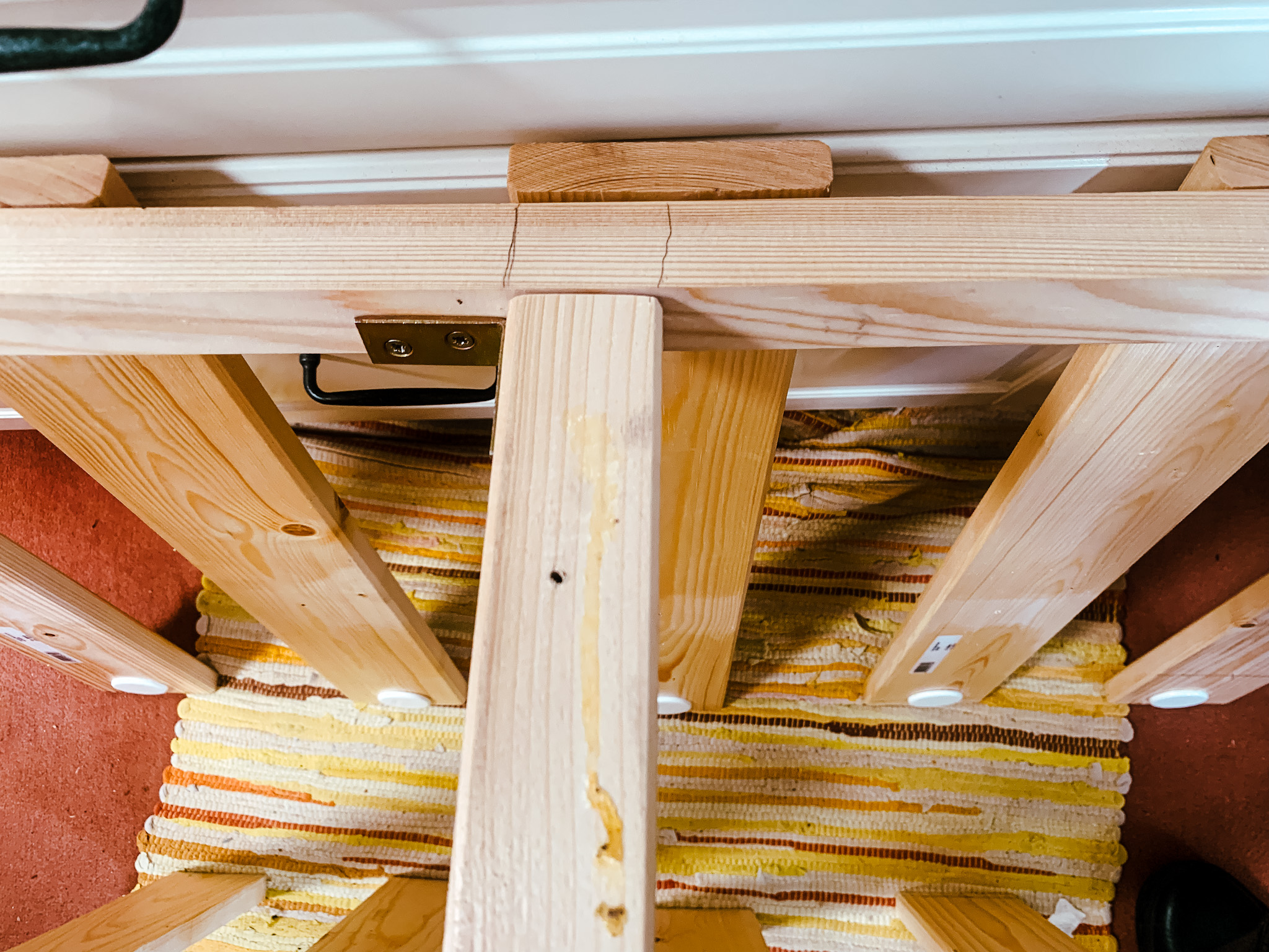 Stopp Kantholz: dieses Kantholz sorg dafür, dass der ausziehbare Teil nicht herausrutschen kann. Für die genauen Maße ziehst du das Ausziehteil auf die gewünschte Breite heraus, zeichnest dir an 2 oder 3 Brettern untendrunter das Maß an und setzt dort ein flaches Kantholz gegen. An jedem der 2-3 Bretter einzeln.