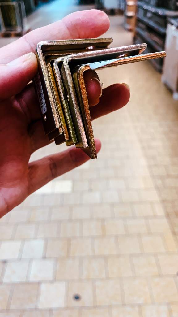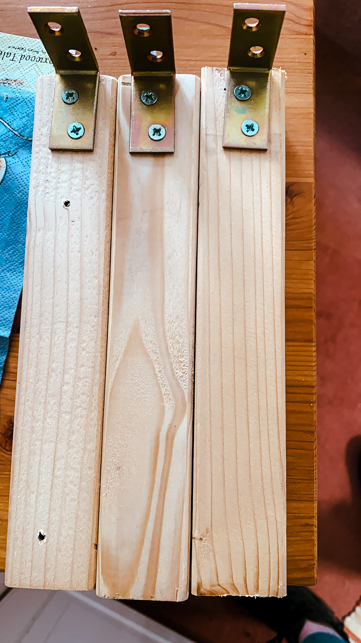 Die Füße habe ich aus Kantholzresten geschnitten, sie sind 24cm hoch. Befestigt wurden sie mit schmalen Winkeln. Tipp: achte darauf, dass die Winkel zum Kantholz mit den kleinsten Durchmesser passen, sie dürfen nicht vorstehen.