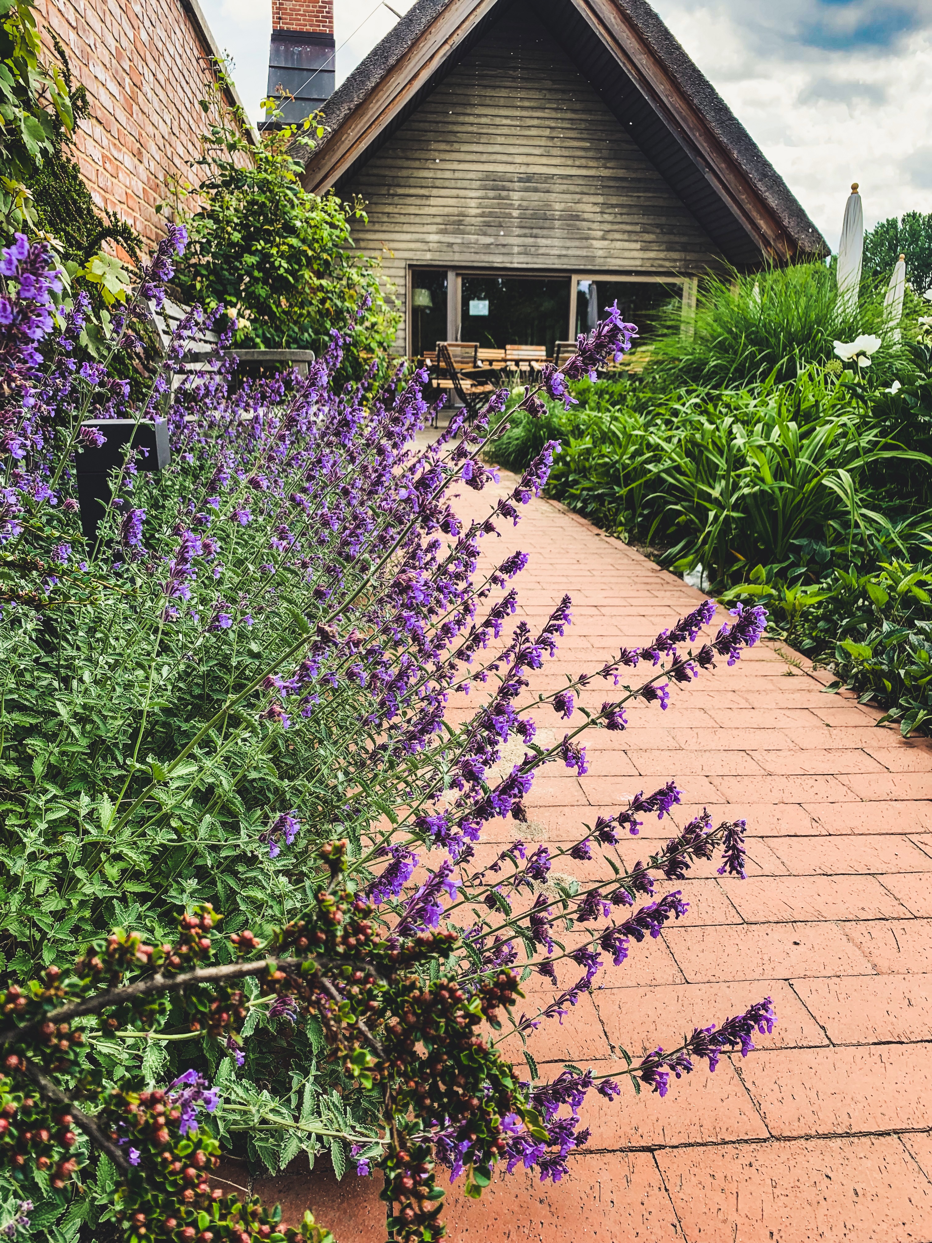 Themengarten mit Cottage Café, vielen Rosen, einem formalen Gemüsegarten, einem Cottagegarten.