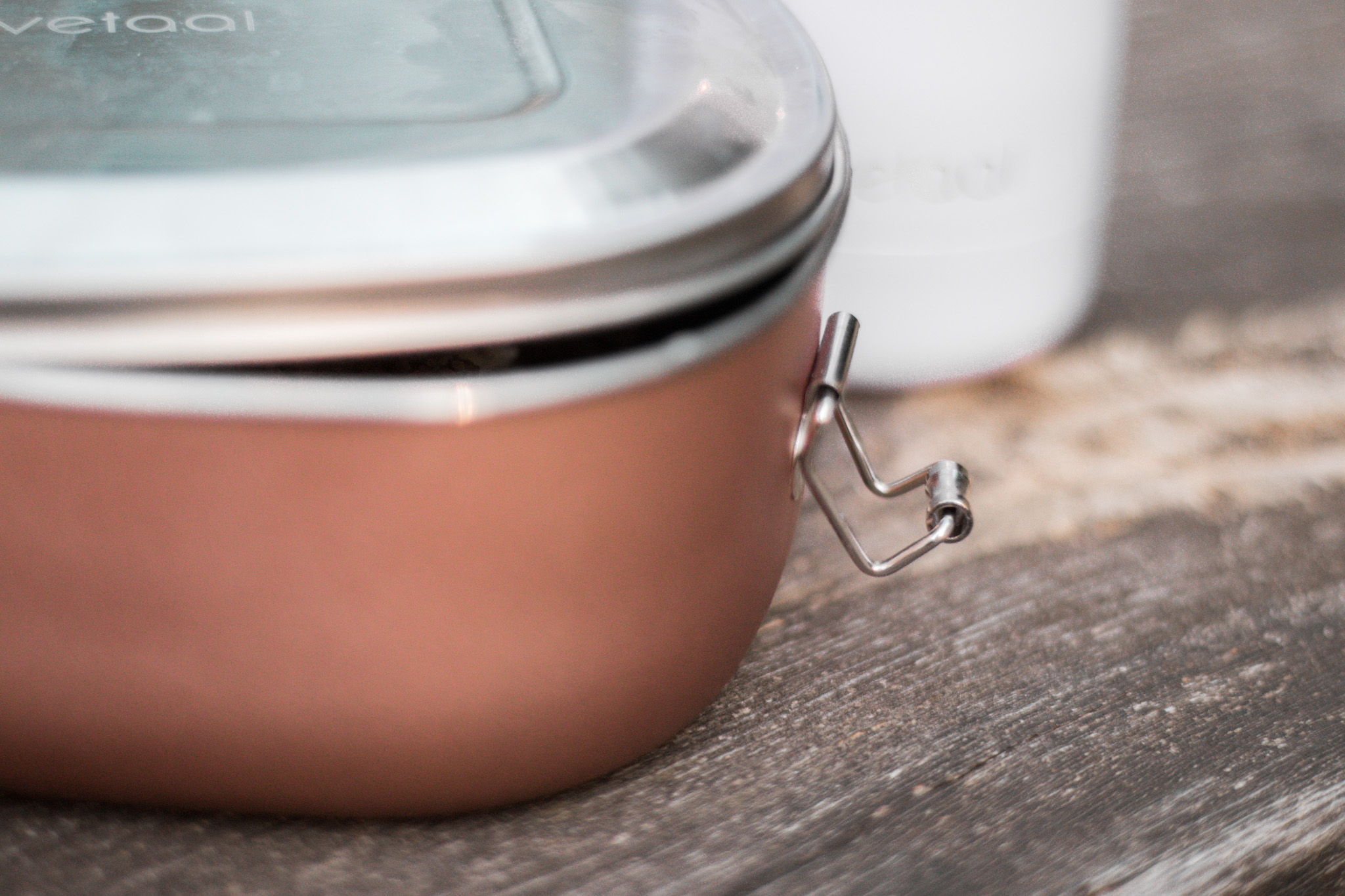 Die Brotdose ist aus einfachem Edelstahl, ich liebe ihr Retrodesign mit den stylischen Bügelverschlüssen, sie ist ein echter Hingucker, was vielleicht auch an meiner Farbwahl liegt, Rosé-Gold passt einfach so sehr zum Retro Design.