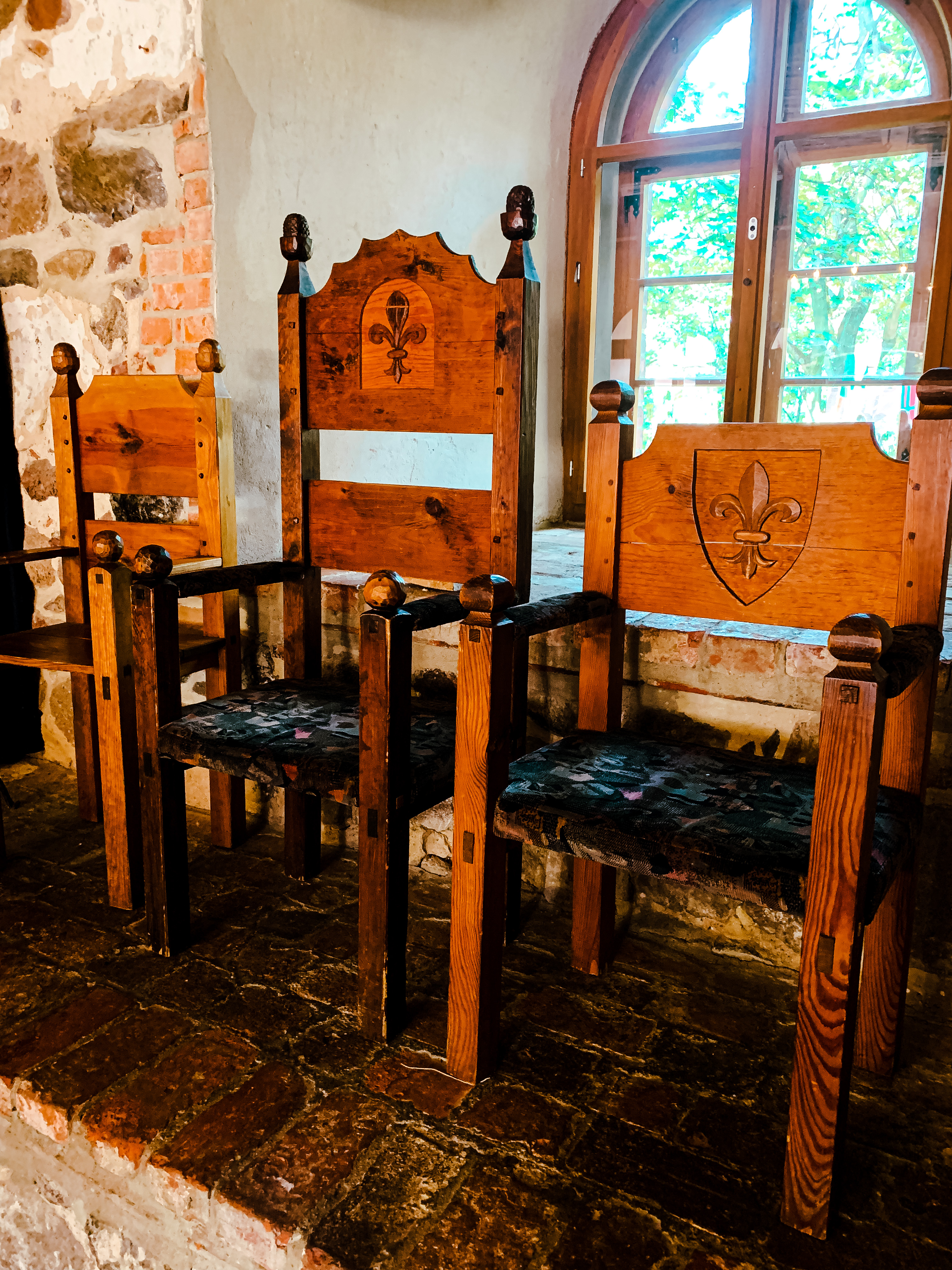 Wenn du die geschichtlichen Hinweise im Torhaus gelesen hast, wirst du feststellen, dass die Wappen der einstigen Burgeigentümer im Rittersaal zu finden sind. Dieser Saal, mit seinem urigen Flair, den beiden Kaminen und den uralten hölzernen Stühlen vereint für mich am meisten das ritterlich mittelalterliche Burgenfeeling.