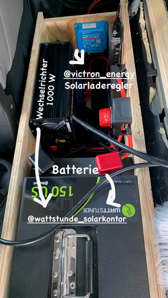 verbaut habe ich eine Untersitzbatterie 150 Ampere von Wattstunde, einen 1000 Watt Wechselrichter von Wattstunde, Solarladeregler von Victron Energie 15 Ampere, Schaudt 9990359 Ladebooster WA 121525, ein Batterie Ladegerät Victron Energie 15 Ampere, eine Außensteckdose von Schwabe, eine ganz normale 230 Volt Haushaltssteckdose (am besten mit Klappe), einen Feuchtraumverteiler für die 230 Volt Kabel sowie diverse Kabel, Sicherungen, Kästen, Schalter, die ihr in meinem Amazon Shop findet.