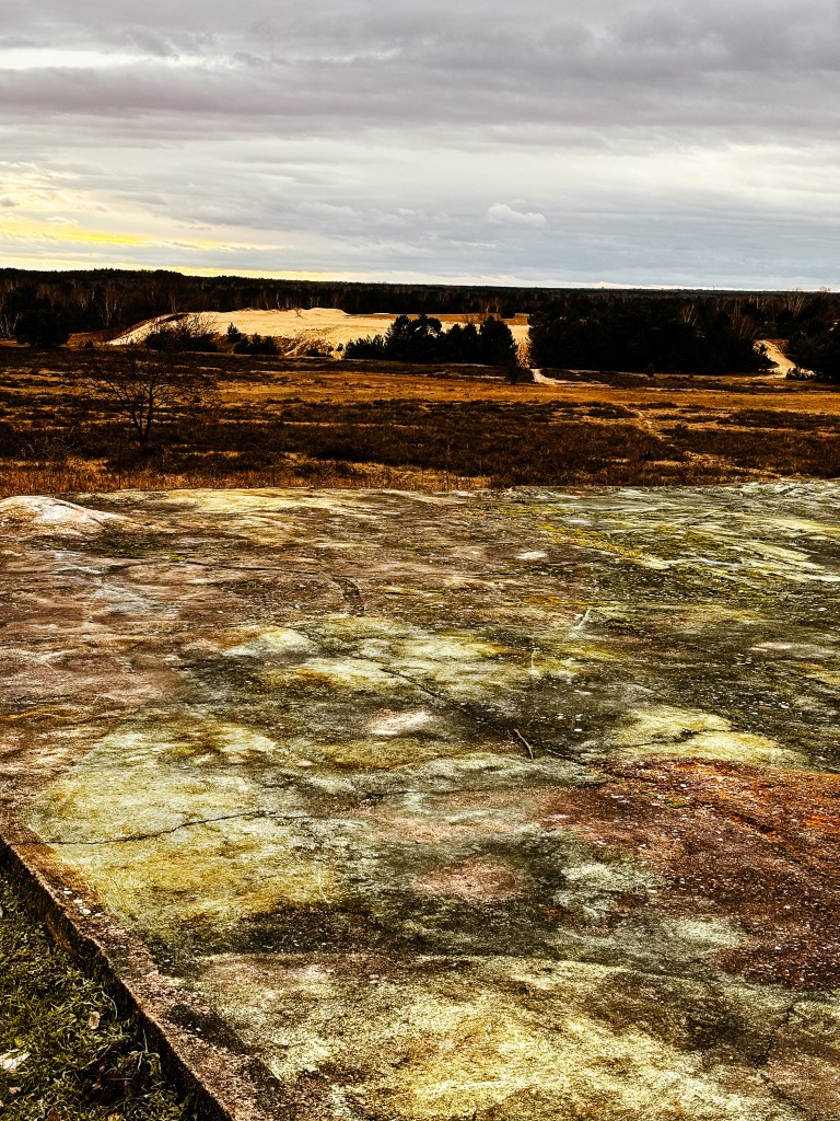 Oben befindet sich ein Lost Place, ein Kommandobunker des ehemaligen TÜP, den man erkunden kann. Er ist unspektakulär, dafür der Blick zur Düne um so schöner. Vor dem Bunker könnt ihr die Reste eines Reliefs am Boden erkennen. Dort war einst das Gelände mit alles Gebäuden in Miniatur abgebildet.