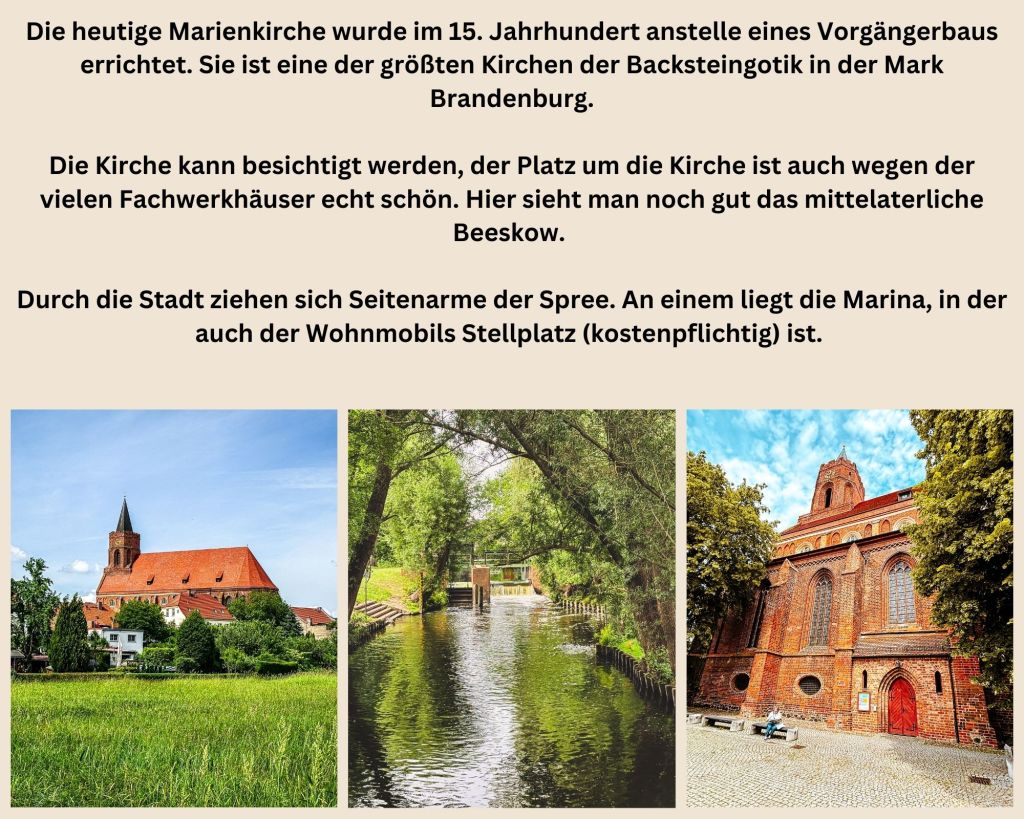 | Parken: in der Stadt gibt es mehrere Parkplätze und auch entlang der Straßen kann man parken. Mit großen Wohnmobilen wird es jedoch eng. Ich würde mir vor der Stadtmauer einen Platz suchen. Wohnmobil Stellplatz in der Marina (kostenpflichtig) Beeskow – Charlottenhof 26 hier gibt es einen weiteren kostenpflichtigen Stellplatz |