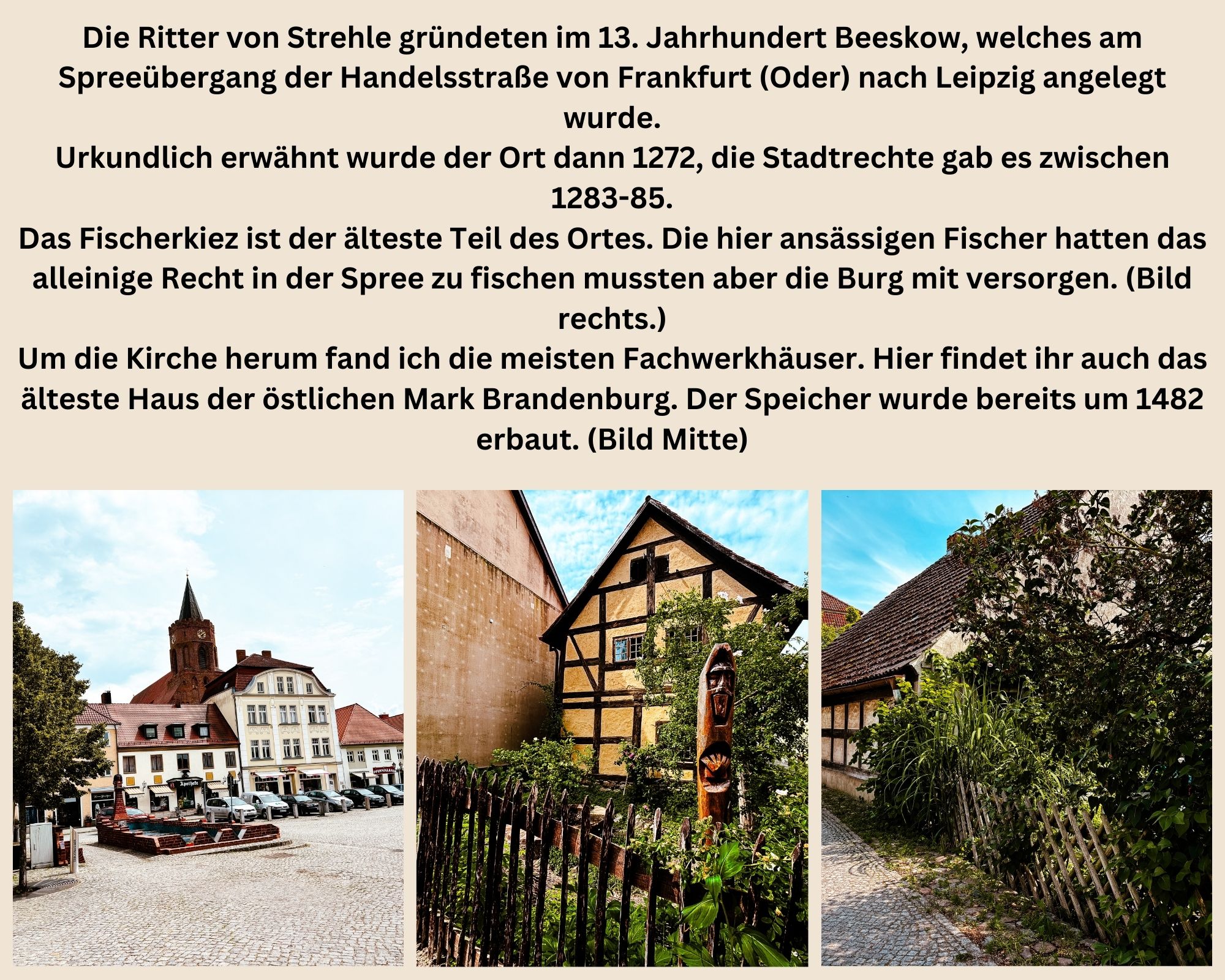 Mir hat Beeskow sehr gut gefallen, die Mischung aus Fachwerk, restaurierten Bürgerhäusern und grünen Wegen an der Spree entlang macht es. Die Stadtmauer ist eine meiner Highlights auf der historische Stadtkerne Brandenburg Tour.