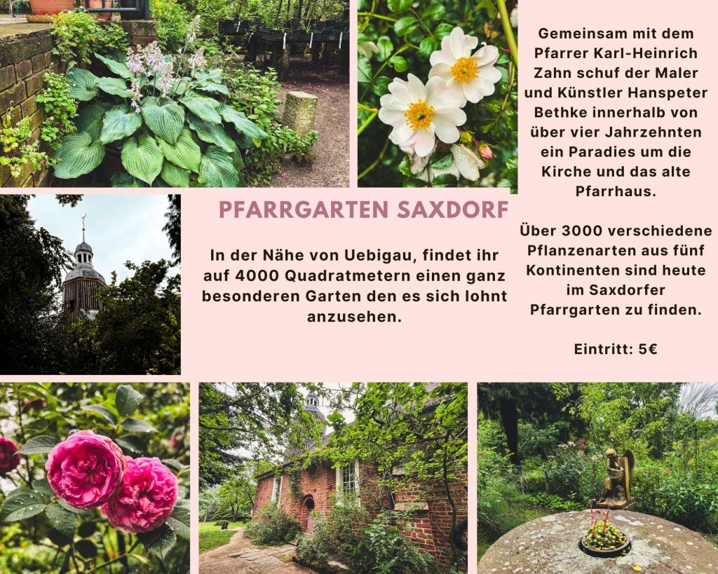 Der Garten, der jährlich mehrere tausend Besucher anlockt, liegt gerade einmal 10 Kilometer von Bad Liebenwerda entfernt. Besonders beliebt sind die Veranstaltungen im Garten, wie der Saxdorfer Musiksommer. Im Pfarrhaus gibt es unten Bilder des Malers Bethke und eine echt interessante Ausstellung zur Zeit des Gartens in der DDR.