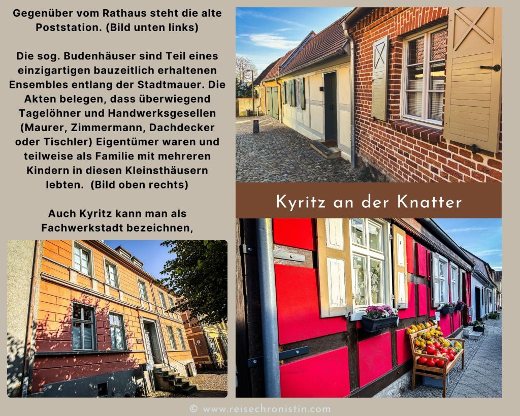 | Sehenswertes in Kyritz • Marktplatz mit Rathaus • Posthalterei gegenüber vom Rathaus • Fachwerkhäuser in allen Straßen der Altstadt • Kirche • Kloster mit Klostergarten • Budenhäuser • Rosengarten an der Stadtmauer • Stadtmauerrundweg • Brunnen mit der Stadtgeschichte am Markt |
