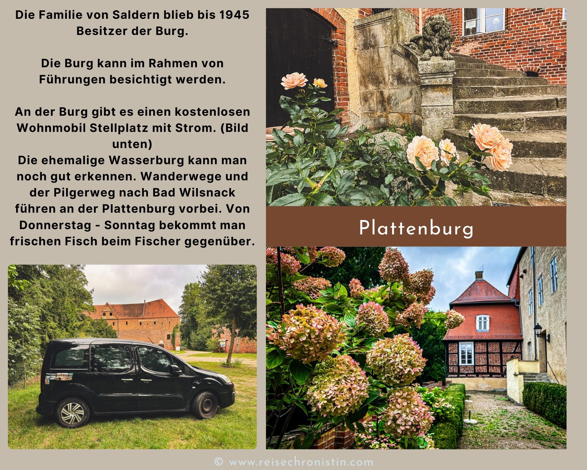 | Parken an der Plattenburg Es gibt einen PKW Parkplatz direkt and der Burg. Bei Veranstaltungen kann man auch im Ort parken, hier befindet sich ein riesiger Parkplatz. Der Wohnmobil Stellplatz ist für 4 Fahrzeuge, er hat nur Strom, keine V/E und keine Mülleimer. Der Platz ist unbefestigt und leicht schräg, man findet aber eine perfekte Stelle. Das Internet ist hier praktisch kaum vorhanden, ich hatte 1 Balken LTE. Man steht sonnig bis halbschattig und da rings herum Wasser ist gibt es auch Mücken. Homepage der Plattenburg besucht am: 17. September 2024 |