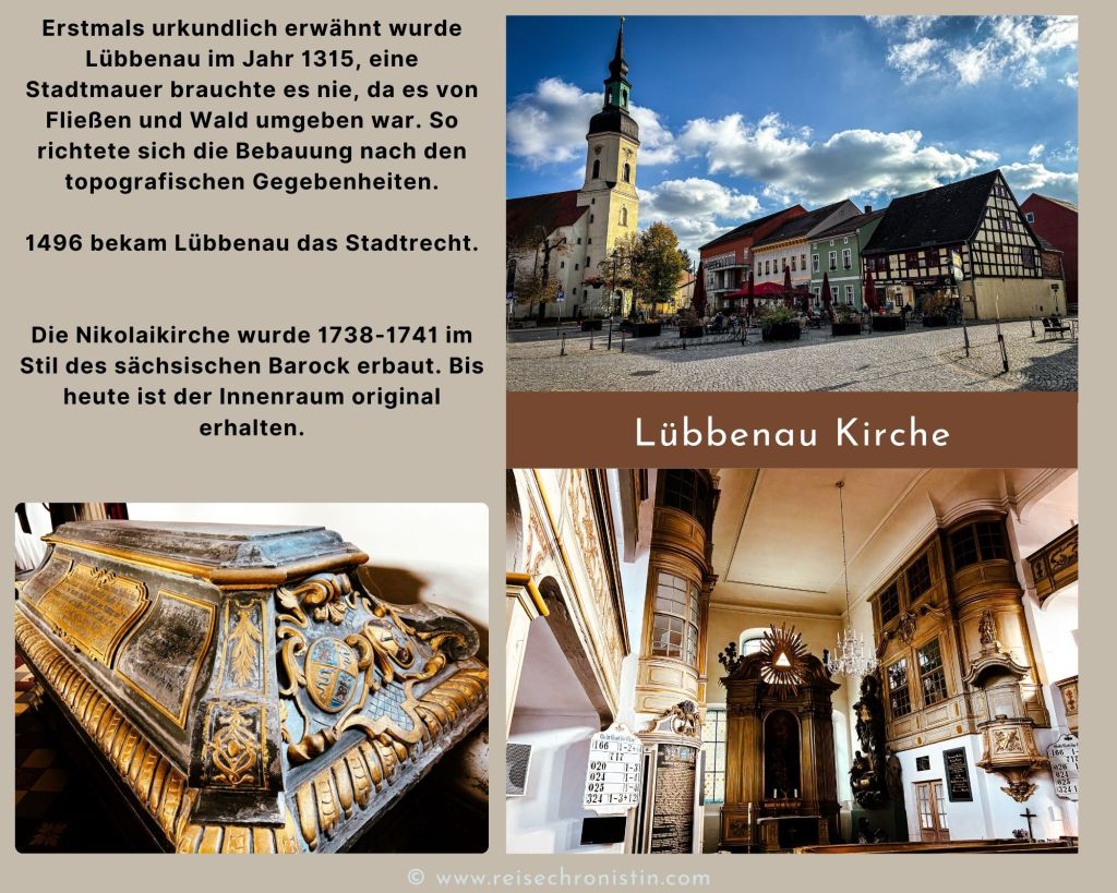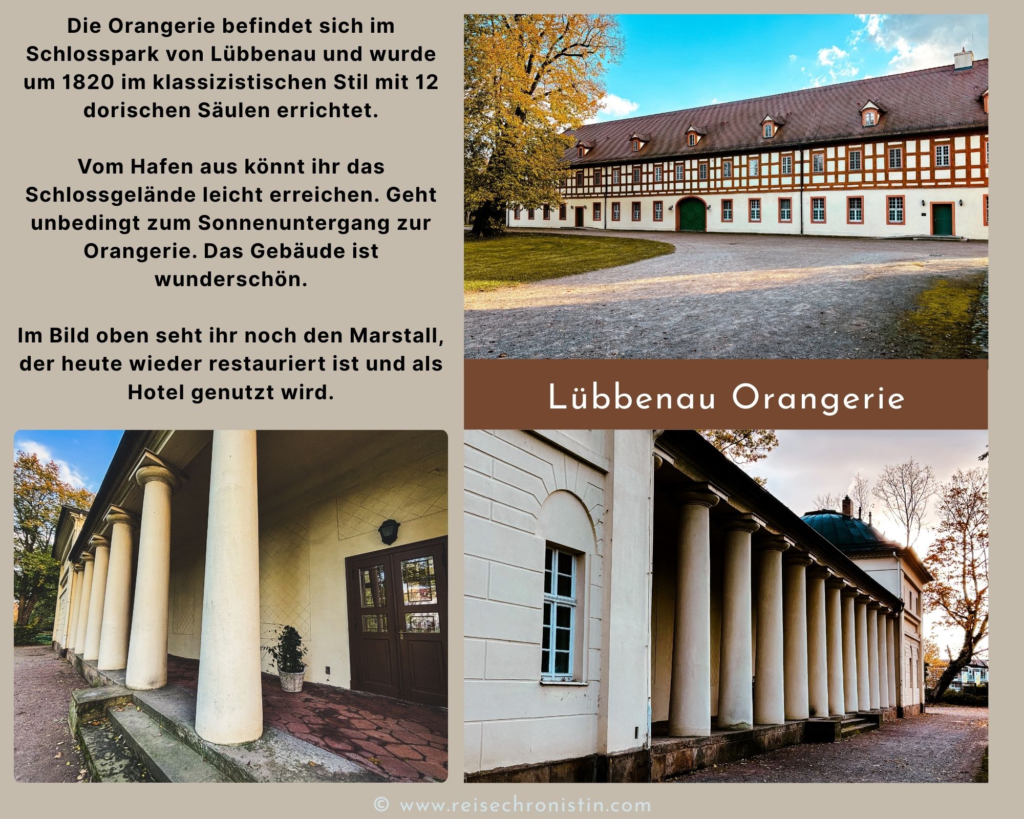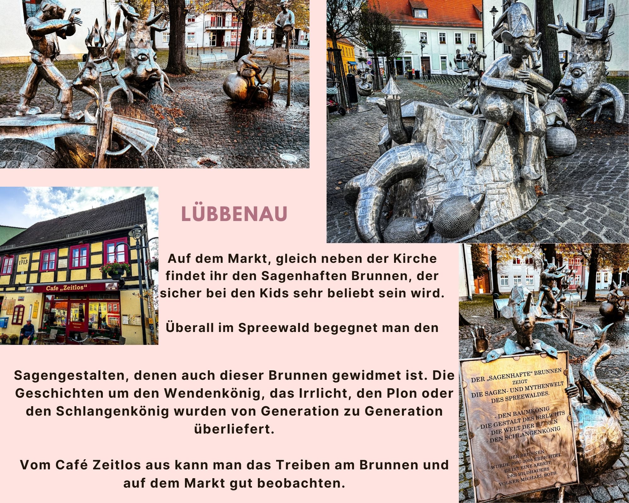 | Sehenswertes in Lübbenau • Altstadt mit Markt, Kirche, Brunnen • Großer Kahnhafen mit Gurkenmeile • Schloss und Orangerie • Spreewaldmuseum • Brauerei, Brauergasse • Fachwerk in der Altstadt • Torbogenhaus • Sagenhafter Brunnen • Brücken (Bänke) im Hafen |