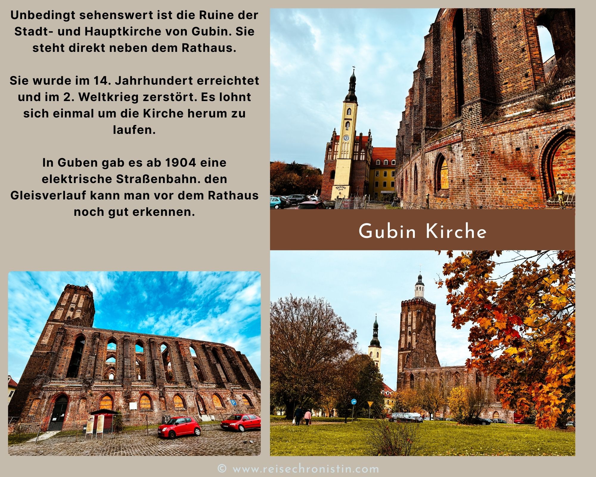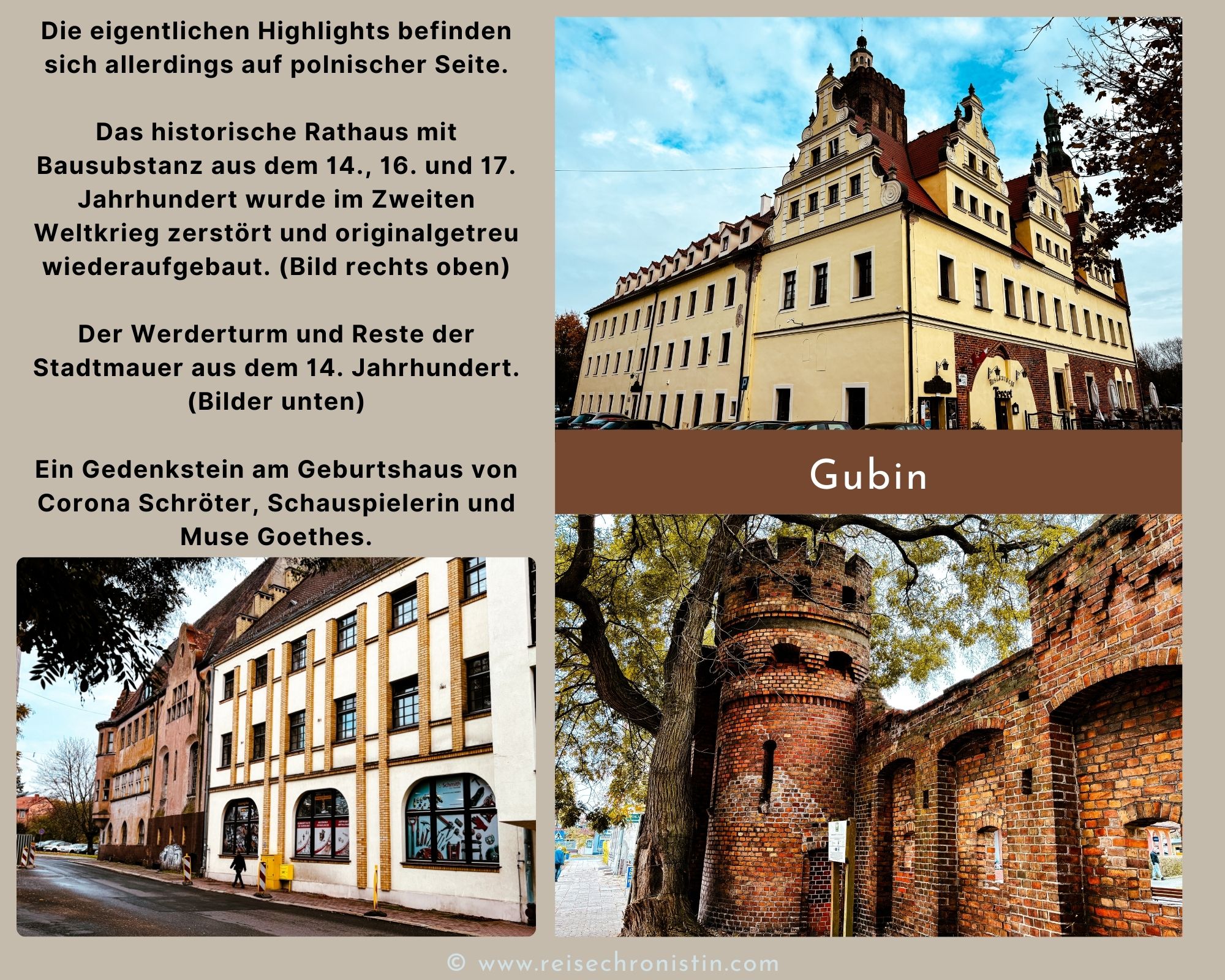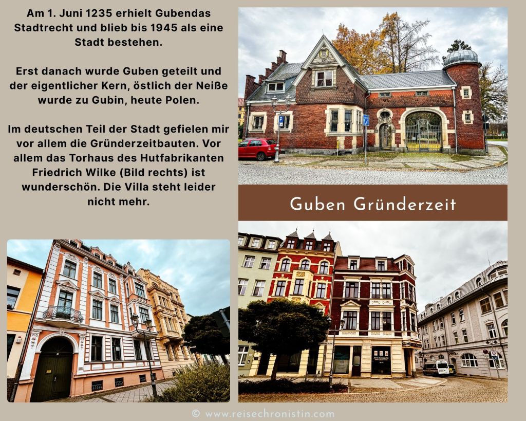 | Sehenswertes in Guben und Gubin • Rathaus Gubin • Ruine der Stadtkirche Gubin • Reste der Stadtmauer und Museum Gubin • Theaterinsel • Gedenkstein am Geburtshaus von Corona Schröter • Gründerzeitarchitektur in Guben • Industriekultur in Guben • Torhaus der Villa Wilke Guben • Kirche gegenüber dem Torhaus der Villa Wilke Guben • ehemalige Hutfabrik (heute Rathaus Guben) • Klosterkirche Guben |