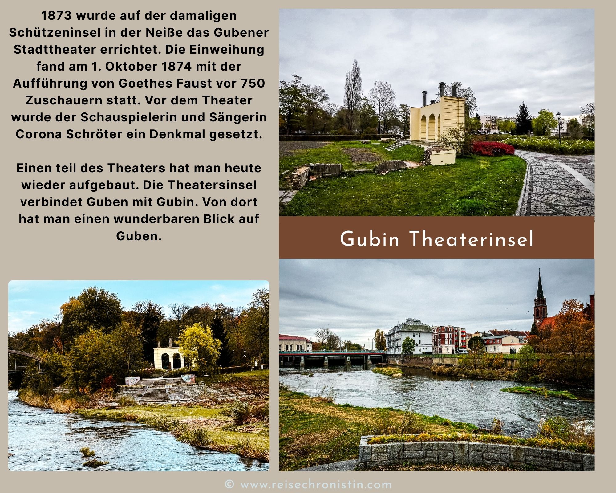 | Gubin: die Ortschaft liegt auf der östlichen Seite der Neiße, an der Mündung des Flusses Lubst in die Neiße. Gubin liegt in Polen. Eine Brücke verbindet die beiden Städte miteinander. Außerdem kann man als Fußgänger oder Radfahrer die Brücke an der Theater Insel nutzen. |