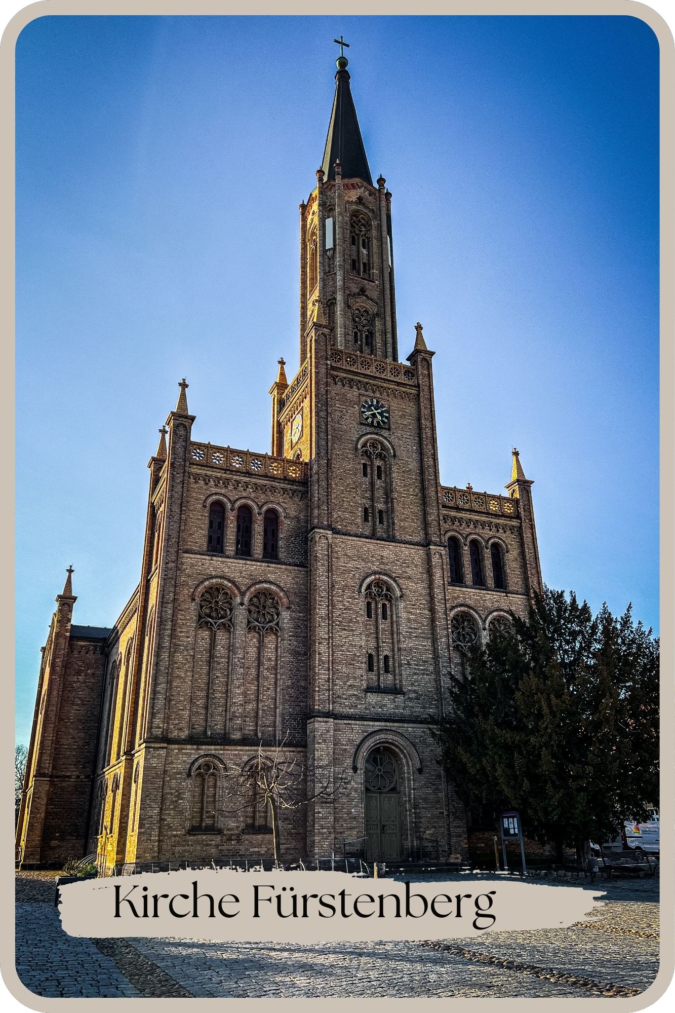 | Kirche Fürstenberg Die heutige Kirche entstand von 1845 bis 1848 nach den Plänen des Architekten Friedrich Wilhelm Buttel, welcher ein Schüler von Friedrich Schinkel war. Die Ausrichtung der Apsis nach Westen hin ist unüblich, ermöglicht so jedoch die Zuwendung der Kirche zum Marktplatz. Da dieser leicht abfallend ist, wirkt das Bauwerk noch imposanter. |